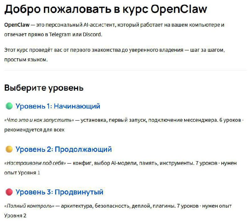 Появился бесплатный курс по OpenClaw — популярному ИИ-агенту, который работает прямо в Telegram и Discord.