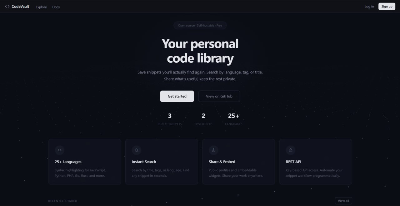 CodeVault — менеджер сниппетов кода с открытым исходным кодом. Что-то вроде GitHub Gists, но с более чистым интерфейсом и дополнительными функциями.