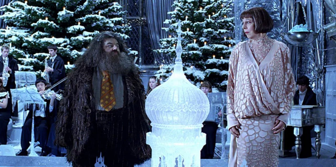 На заднем плане — ёлки, на переднем плане — Хагрид. В костюме форме ёлки. Безо всякого труда мы понимаем, что это человек из леса. Вся его пушистость и ворсистость, мне кажется, тоже очень древесная и ёлочная с одной стороны и животная с другой, что, разумеется, ярко контрастирует с праздничным убранством бала и показывает его неуместность среди всего этого гладкого, скользкого и хрупкого ледяного пространства.