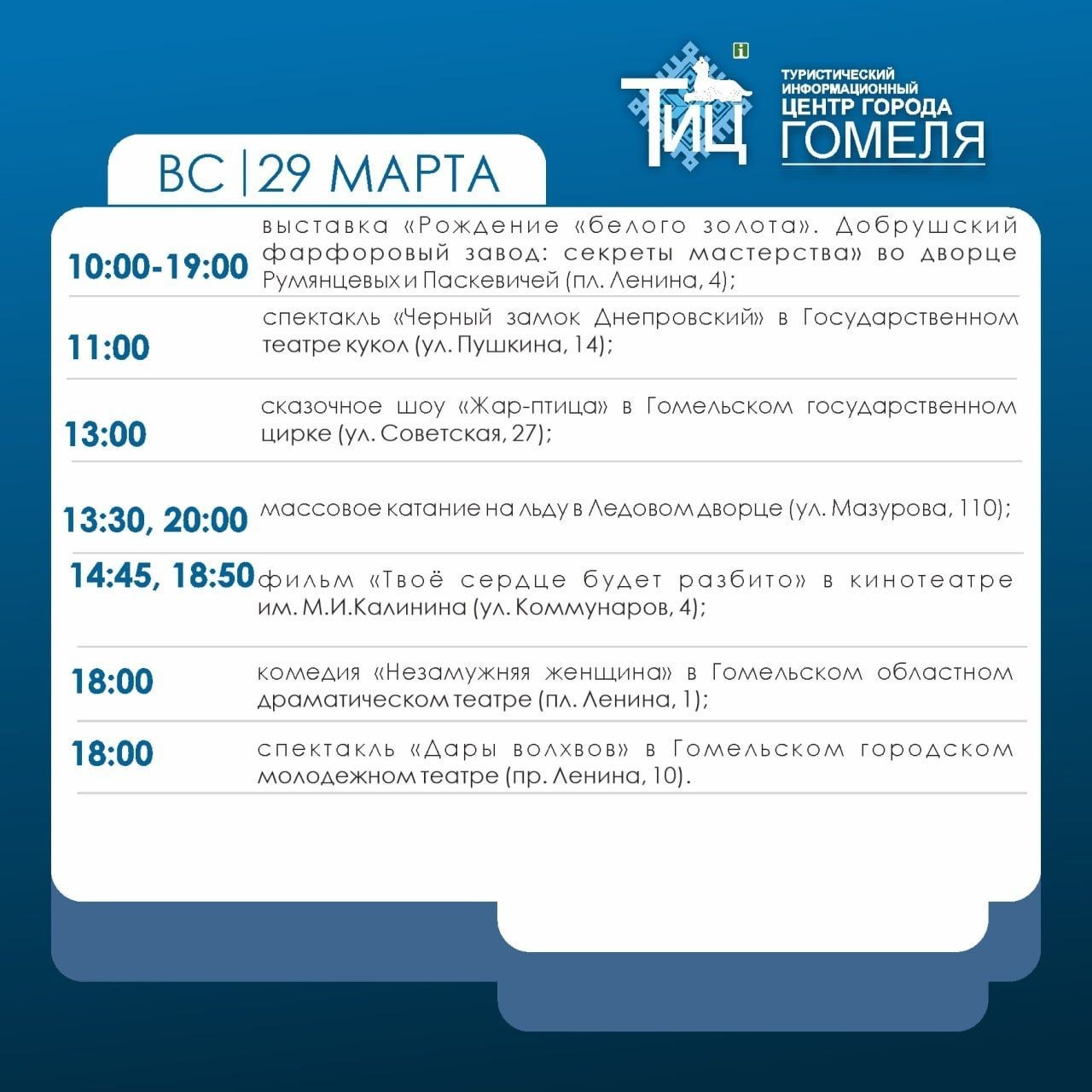 13:00 - сказочное шоу «Жар-птица» в Гомельском государственном цирке (ул. Советская, 27);