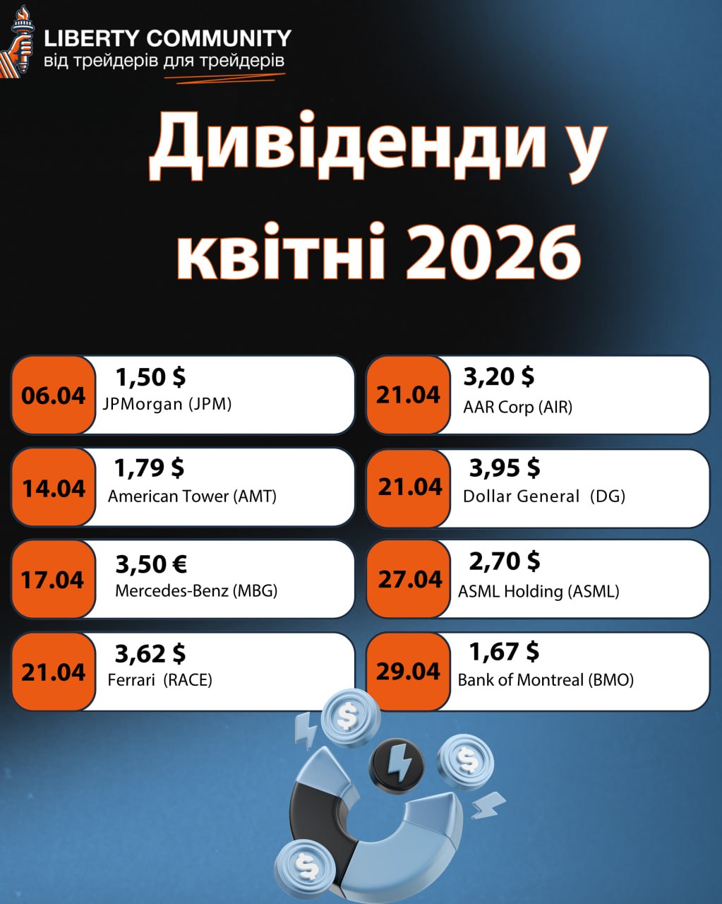 Я зібрала найцікавіші дивідендні виплати на квітень — від технологічних компаній до банків, нерухомості та промисловості.