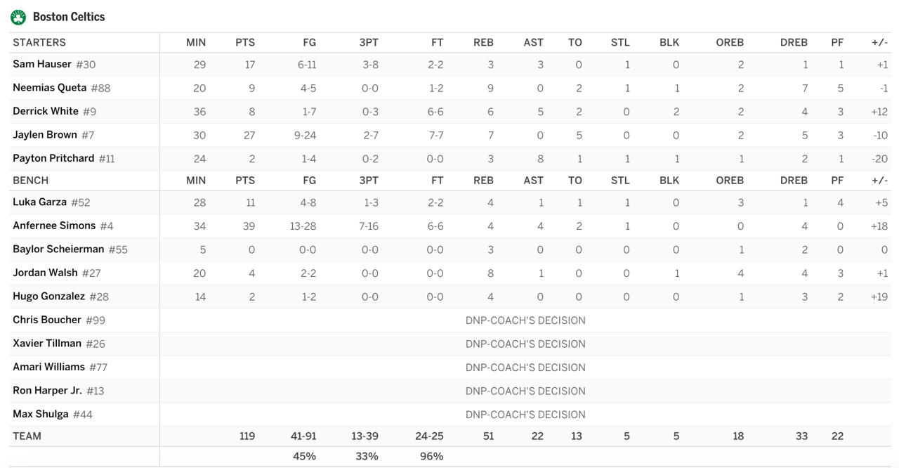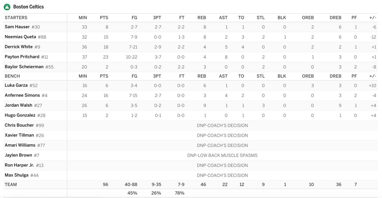 🔴 Тяжёлый вечер лидеров. Браун набрал свои 27 очков, но с 5 потерями и полезностью «-10». Уайт вовсе провалился в атаке (8 очков, 1/7 с игры), хоть и был полезен в командных взаимодействиях (+12). Придчард потерялся совсем 2 очка и «-20» полезности.