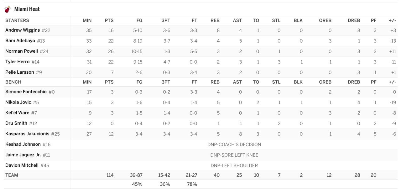 🔴 Провал скамейки. Стартеры «Майами» уничтожали нас (Адебайо +13, Пауэлл +11), но их резерв сыграл ужасно. Йович -19, Смит -9. Именно глубина состава решила исход.
