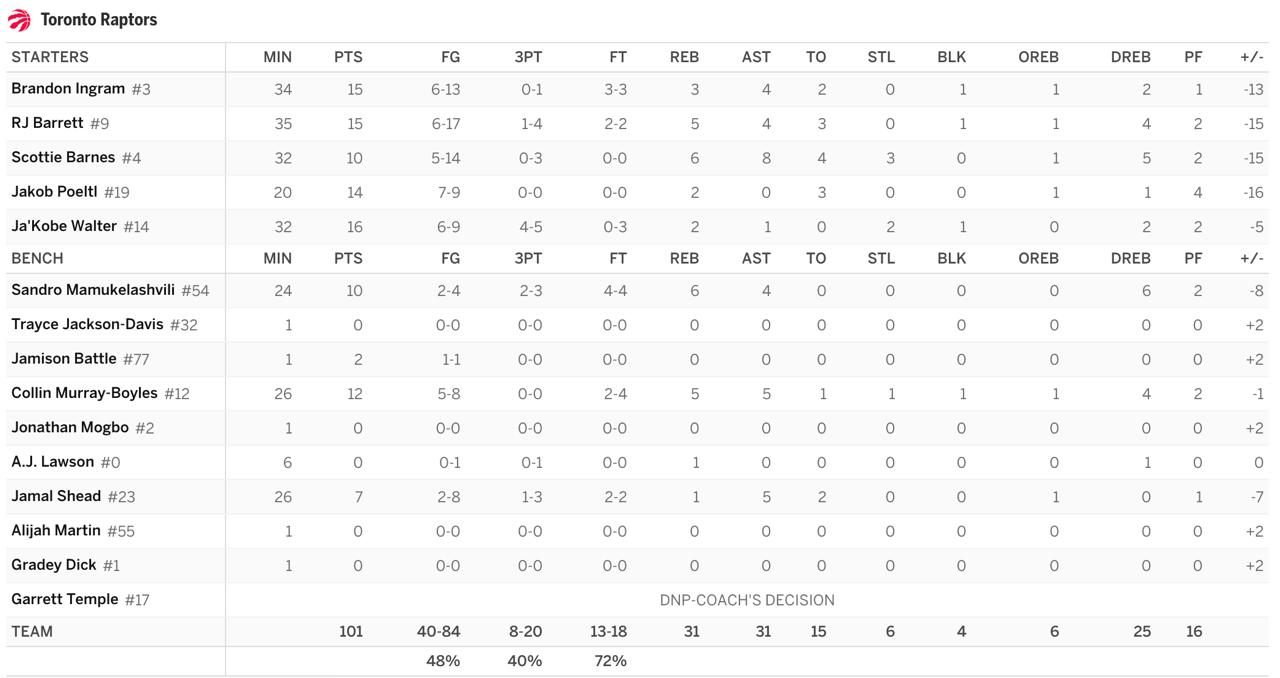 ⚪️ Равномерная атака, но бесполезная основа. У «Торонто» сразу 7 человек набрали 10+ очков. При этом весь старт и игроки ротации, отбегавшие больше 20 минут, ушли в глубокий минус.