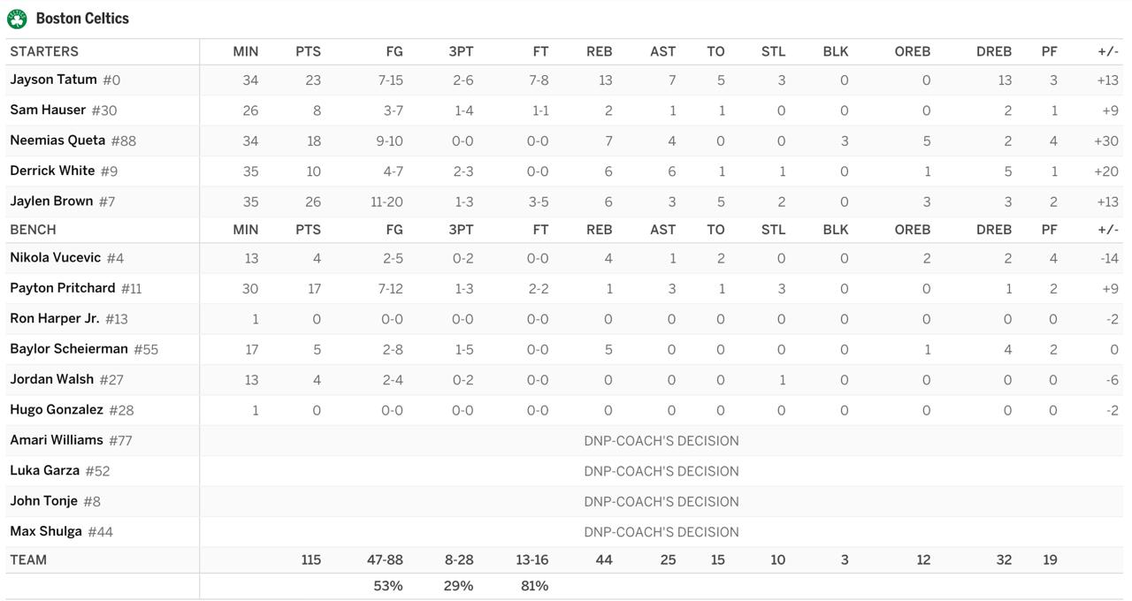 Вот это перформанс от нашего центрового! Идеальный рим-раннер на сегодня: 18 очков, 7 подборов, 4 ассиста и 3 блок-шота при феноменальных 9/10 с игры. Кета выдал лучший показатель эффективности на паркете (+30) и шикарно работал в связке с Тейтумом.