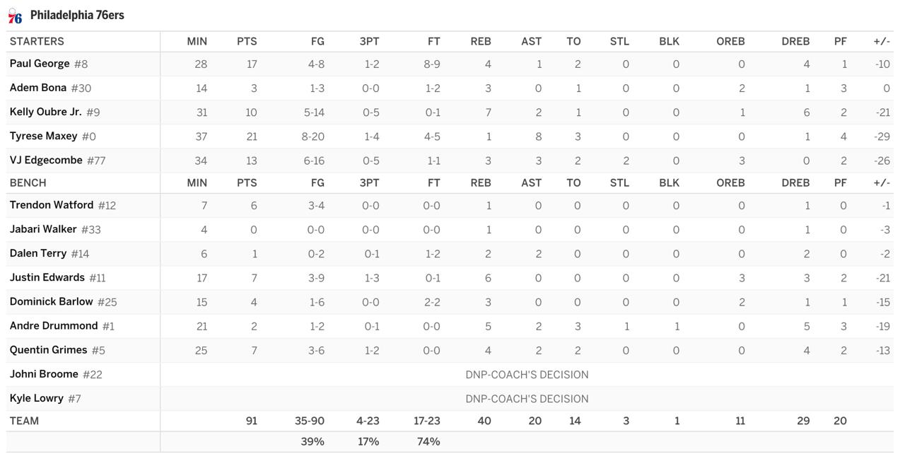 Что касается точности, то согласно CTG, они на 28 месте в лиге по завершению около кольца. Только две команды в лиге были хуже, чем Фила по реализации самых легких, самых точных очков.