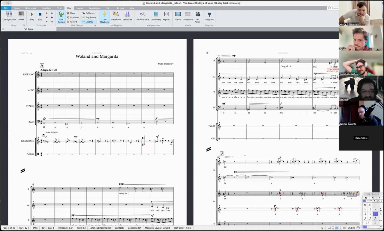 🎼 Марк Трубников работает над масштабным произведением для хора и перкуссии по мотивам «Мастера и Маргариты». 🎭 Проект готовится к отправке на «Хоровую Лабораторию 2026», торопимся уложиться до дедлайна.