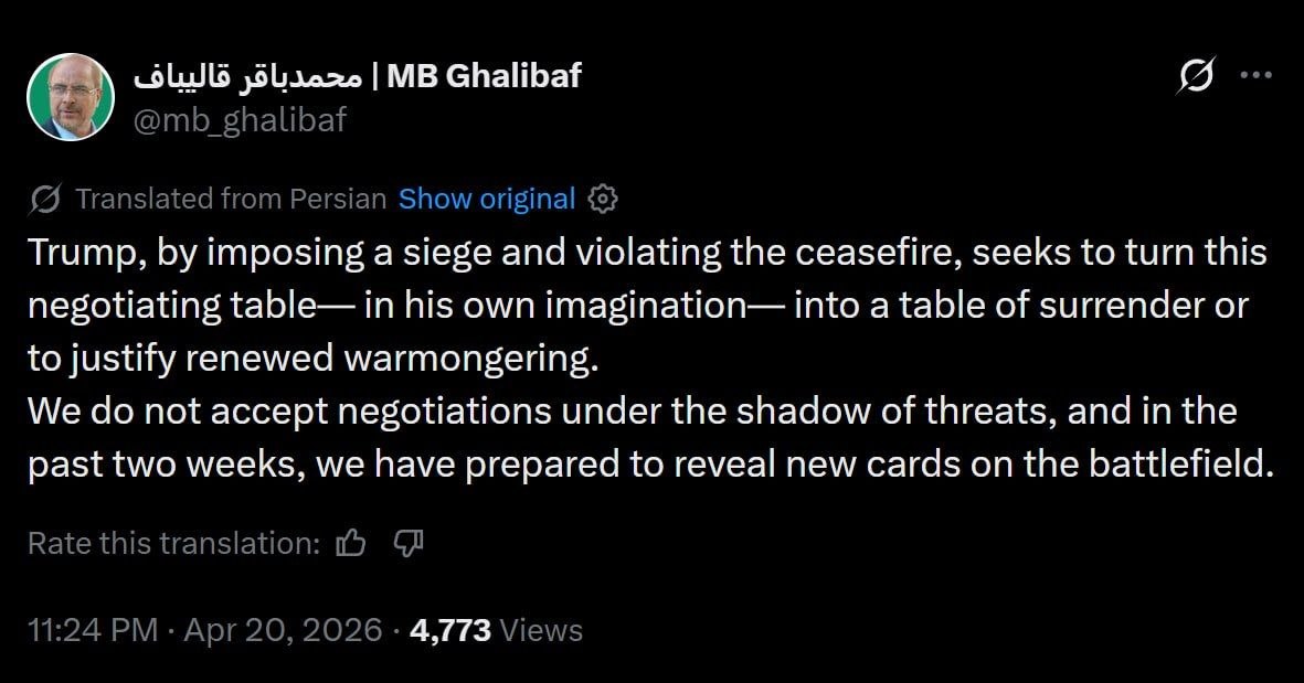 🚨🇮🇷🇺🇸 El portavoz del Parlamento iraní, Ghalibaf: