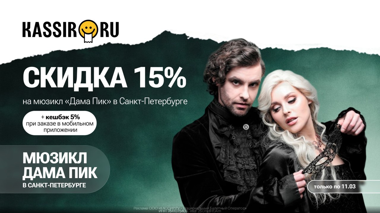 ➡ Покупай билеты на мюзикл "Дама Пик" в Санкт-Петербурге с использованием уникального промокода и получи скидку 15% на стоимость билета + кешбэк 5% на номинал при покупке билетов в мобильном приложении!