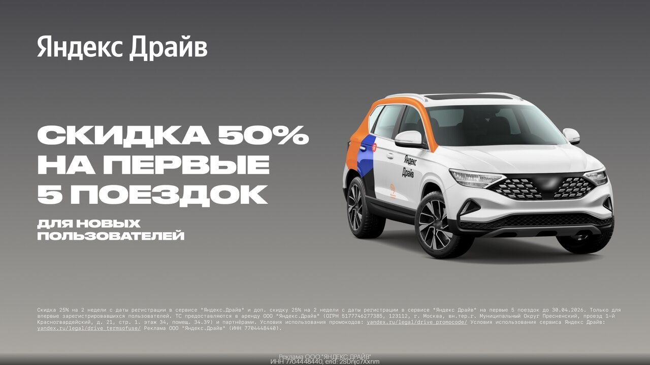 ➡ Арендуйте автомобиль в приложении Яндекс Драйв со скидкой до 50% на первые 5 поездок по уникальному промокоду.