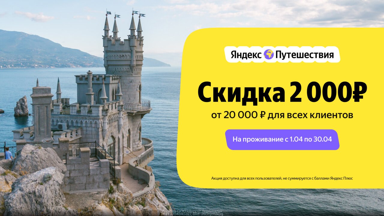 ➡ Забронируй отель на Яндекс Путешествиях и получи скидку 2000 ₽ на любое бронирование от 20 000 ₽!