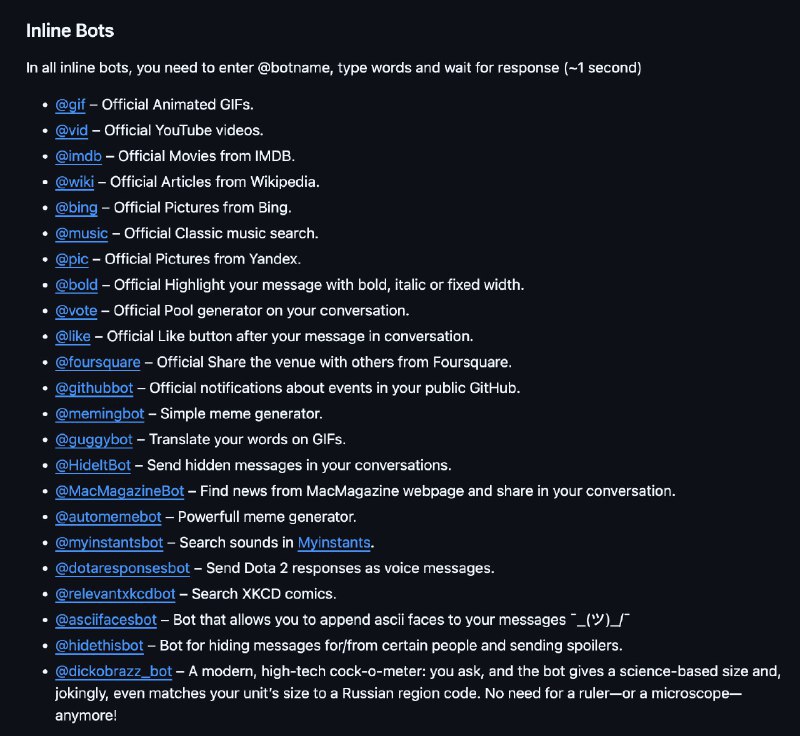 • У каждого бота есть понятное описание и инструкция — разберётся даже тот, кто «я просто нажал».