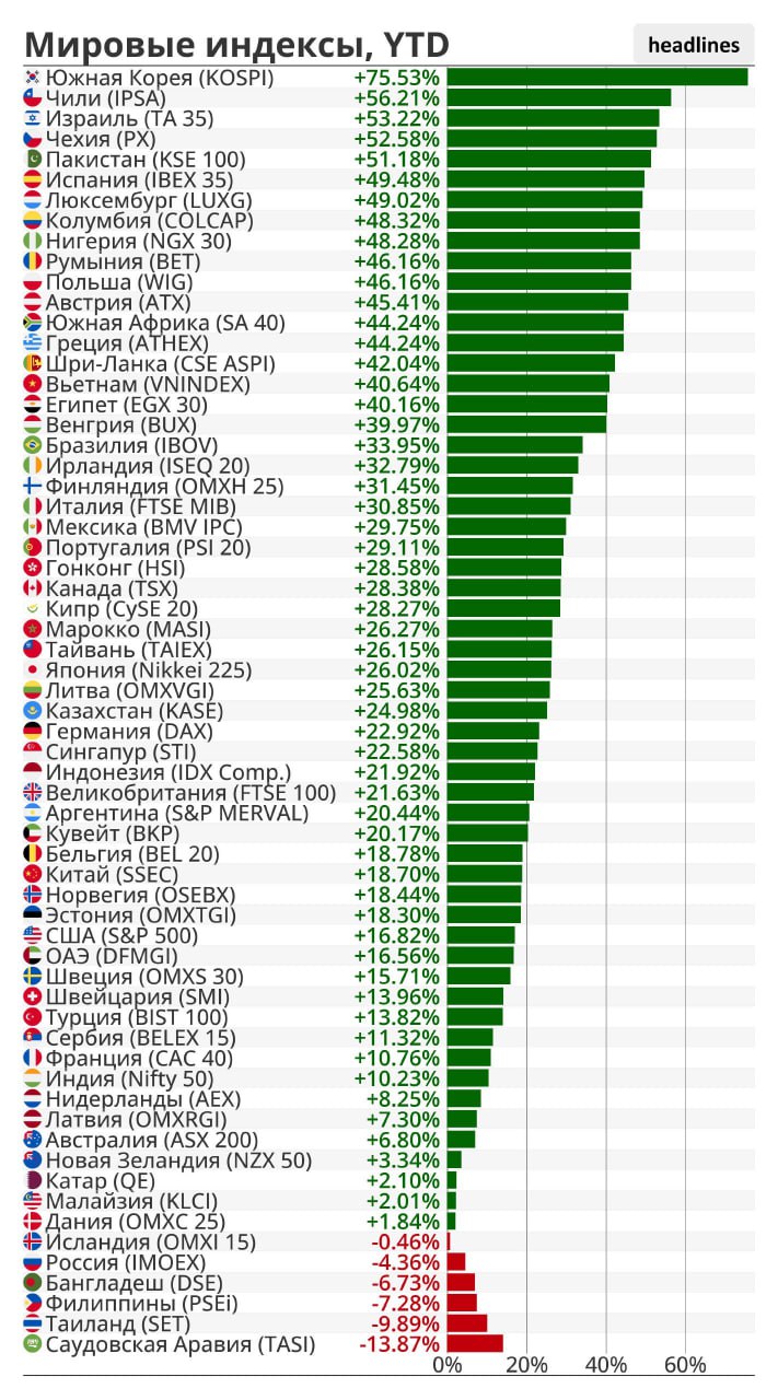 Южная Корея - один из главных бенефициаров ИИ бума*. Эта страна производит критически важные компоненты для ИИ-инфраструктуры (память). Саудовская Аравия упала из-за слабой нефти.