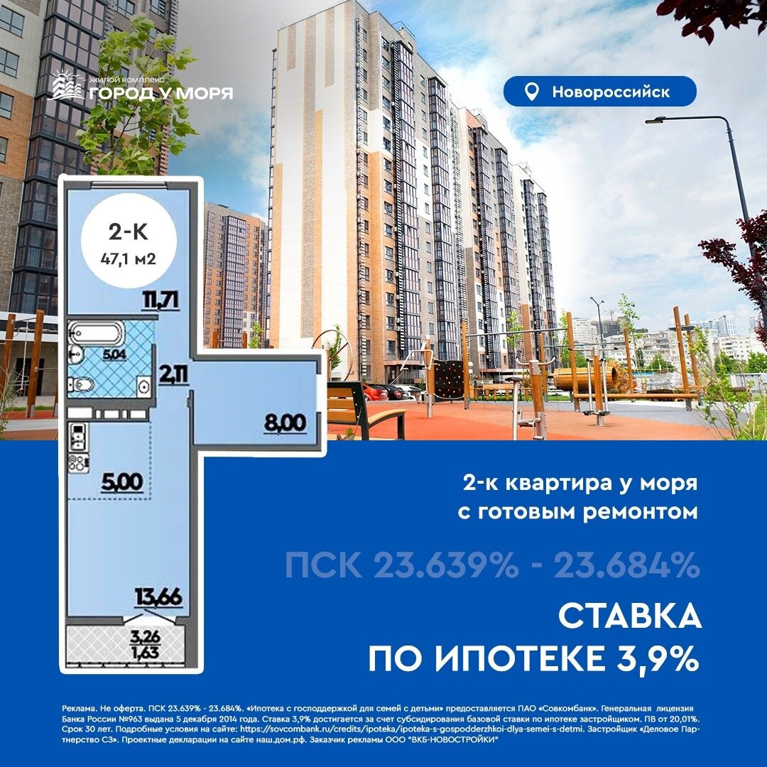 — ПСК 23,639% до 23,684%. Ипотека 3,9% — для семей с детьми до 7 лет.