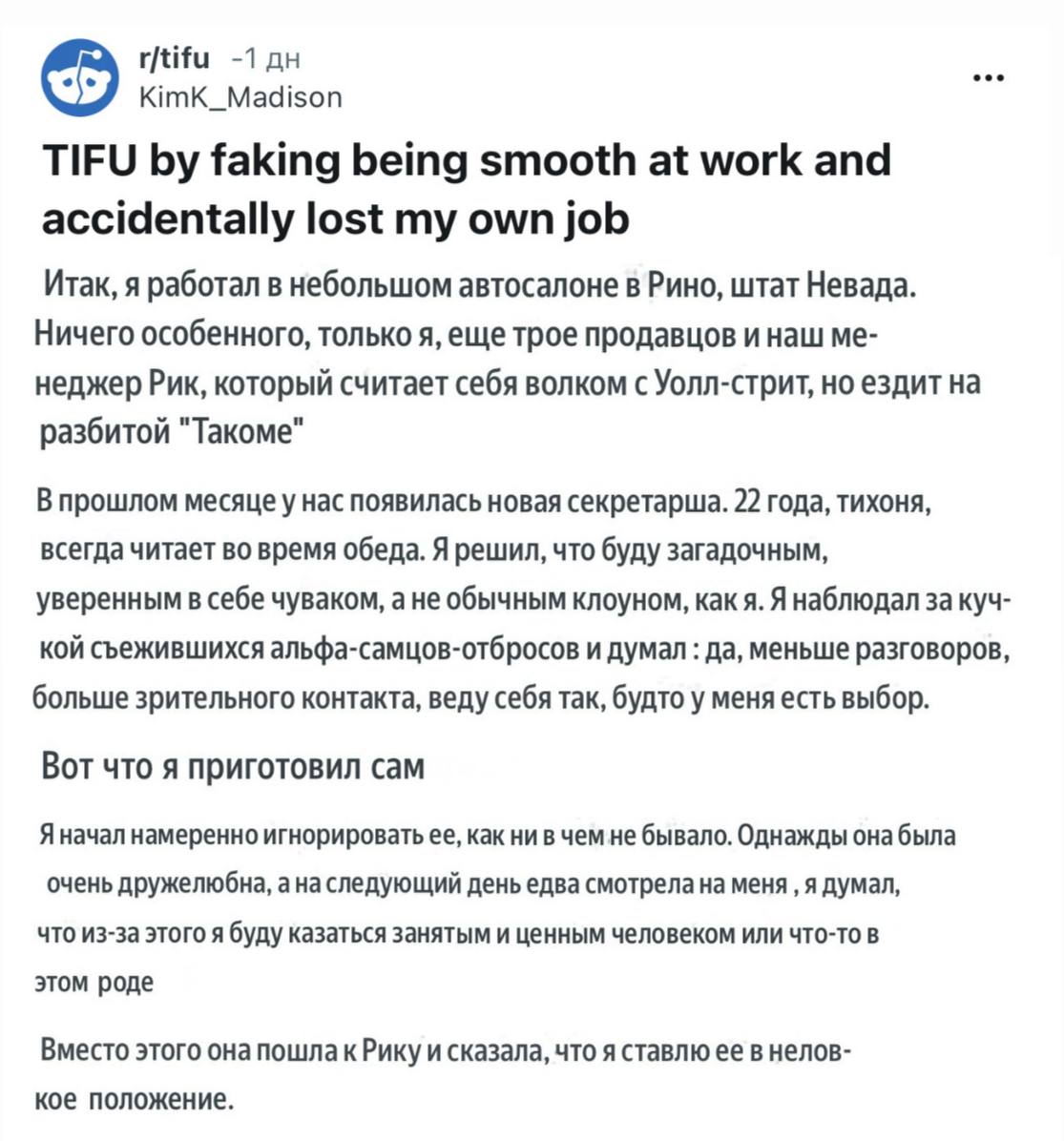 Кокетство на работе сотрудники могут принять за личную неприязнь: на Reddit завирусилась история работяги, который хотел заполучить сердце новой коллеги, но вместо этого лишился работы.