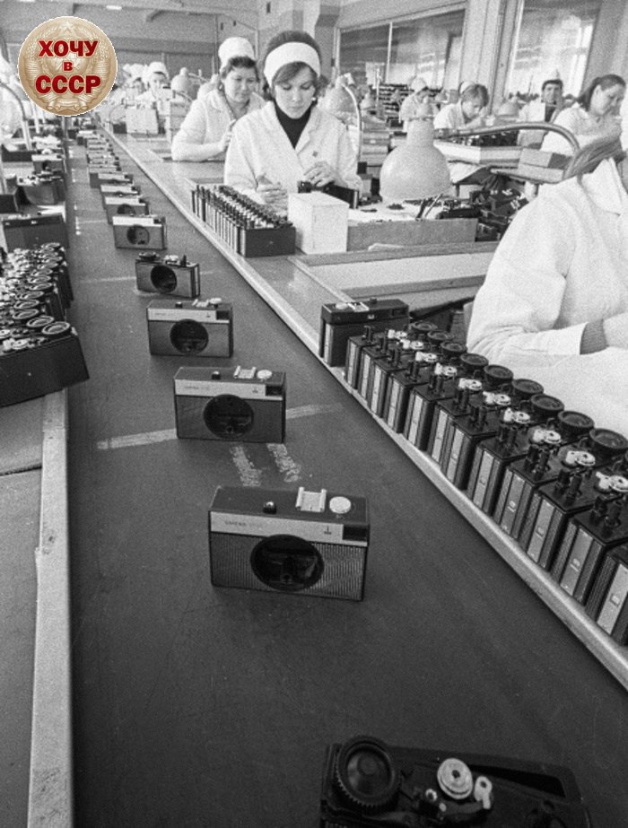 На фотографии конвейер по производству фотоаппарата СМЕНА-8м (Объединение ЛОМО, Ленинград, 1973 год).