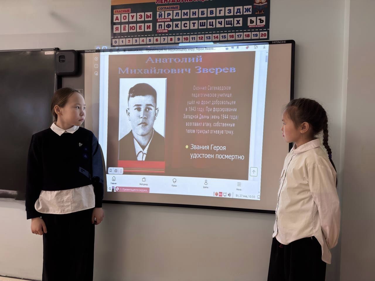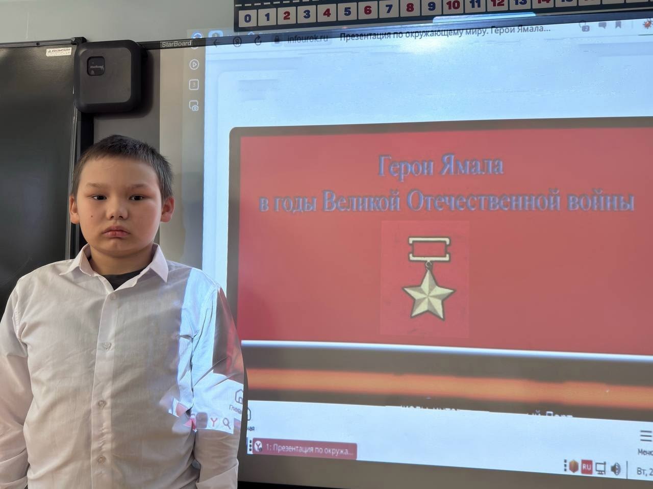 В рамках классных часов, посвящённых героям Ямала — участникам Великой Отечественной войны, ученики 1–4 классов узнали о подвигах своих земляков. Учитель Е. И. Канева поделилась с ребятами историями о мужестве и самоотверженности ямальцев, которые встали на защиту Родины в суровые военные годы.