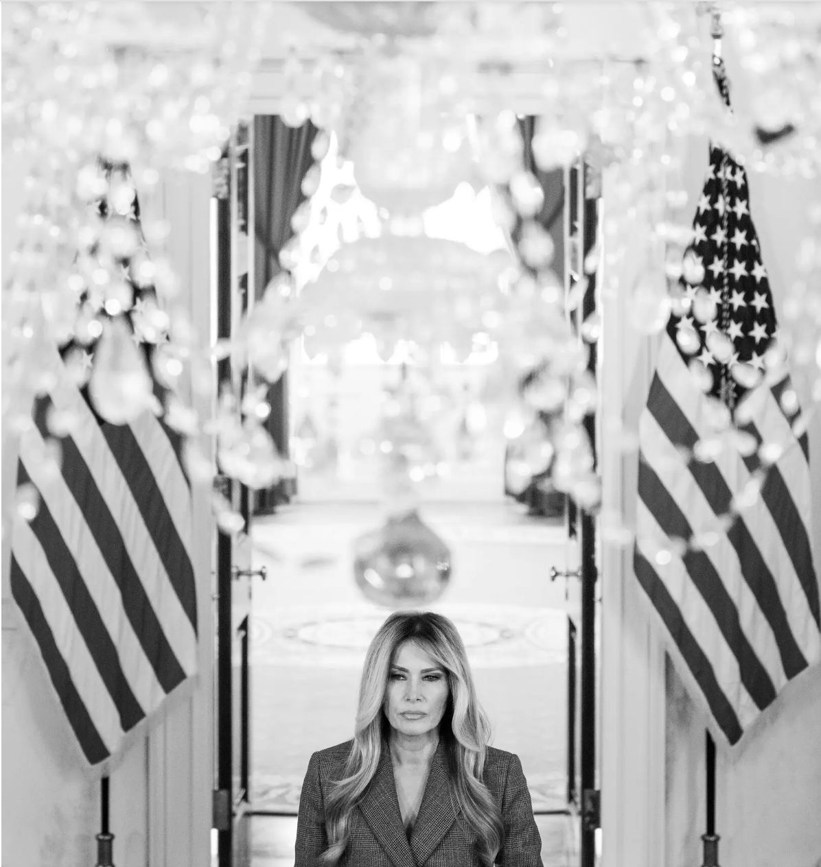 На фото: Мелания Трамп проходит через двойную дверь, обрамленную американскими флагами. Фото: Дэймон Винтер/The New York Times