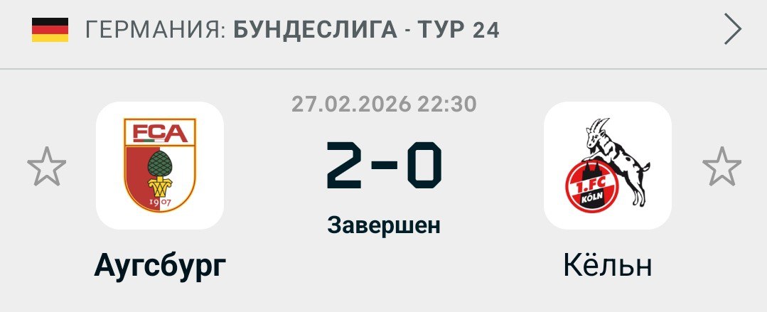 В пяти турах с 24 января «Аугсбург» набрал 12 очков — круче на этом отрезке в Бундеслиге сыграла только «Боруссия» (13). Топ-рывок команды Баума начался с выездной победы над «Баварией» (2:1), а на прошлых выходных она разобралась в гостях с кризисным «Вольфсбургом» (3:2), накопив за 90 минут 1,79 xG и нанеся 15 ударов. В восьми играх 2026 года у баварцев пять раз прошёл ТБ 2,5. После возвращения в Бундеслигу «Кёльн» стабильно радует нейтральных болельщиков яркими матчами. Да, в 2026 году «козлы» набрали только восемь очков из 24 возможных, зато в их встречах 3+ мяча забивались в семи из восьми случаев. В трёх выездных матчах с начала года «Кёльн» каждый раз пропускал не менее двух голов. «Аугсбургу» на руку слабая оборона «козлов», но у тех лучшая атака нижней половины таблицы Бундеслиги.
