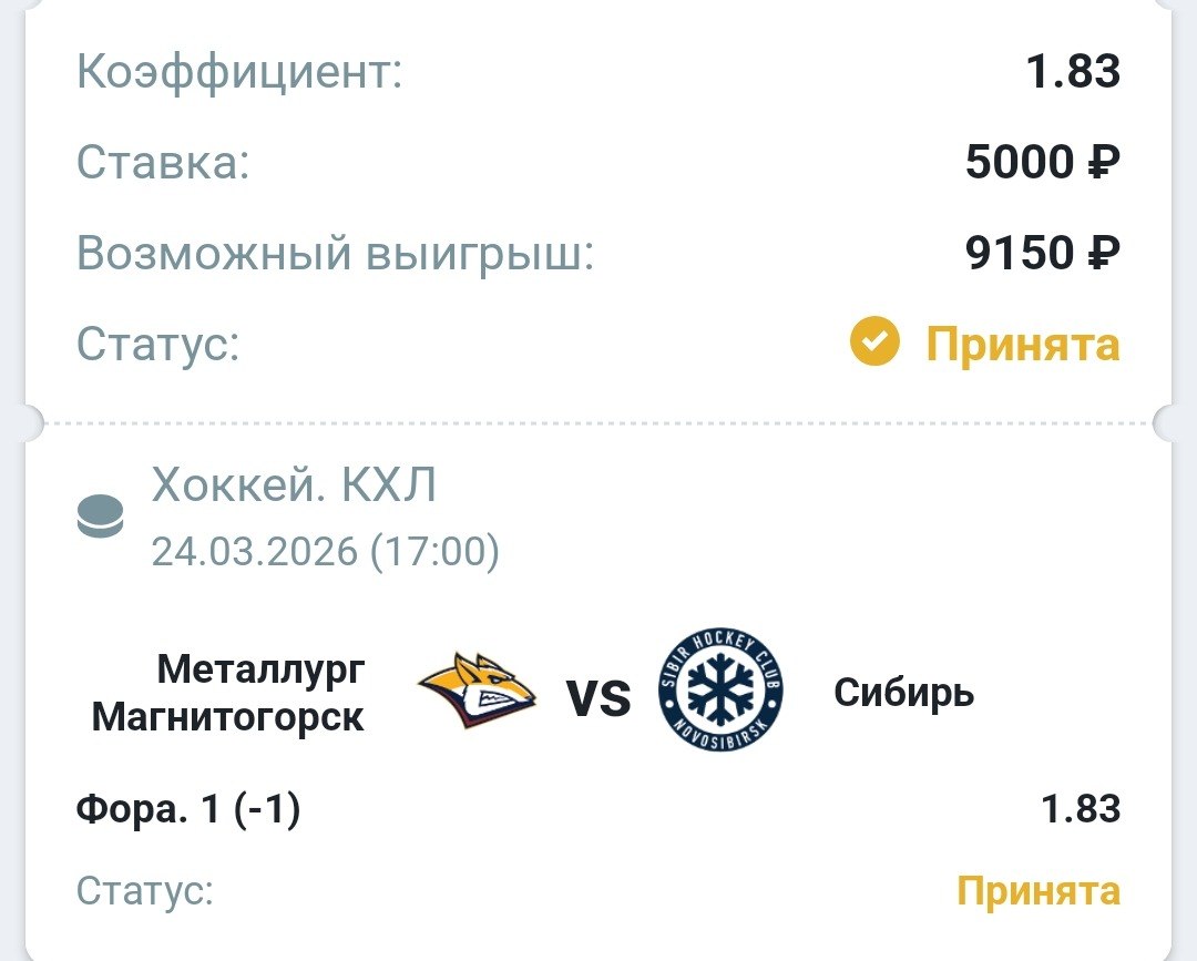 Всем привет, друзья! Магнитка уверенно разделалась с Сибирью. Ставка проходит без валидола. Всех с победой!