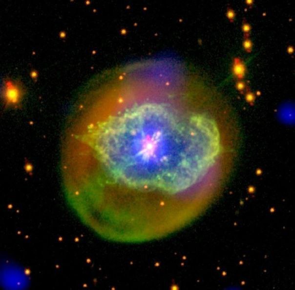 Похожая на Солнце звезда израсходовала весь запас ядерного топлива, сбросила внешние слои в вступила в короткую, но яркую последнюю стадию своей жизни – ее ядро стало остывающим, потухающим белым карликом.