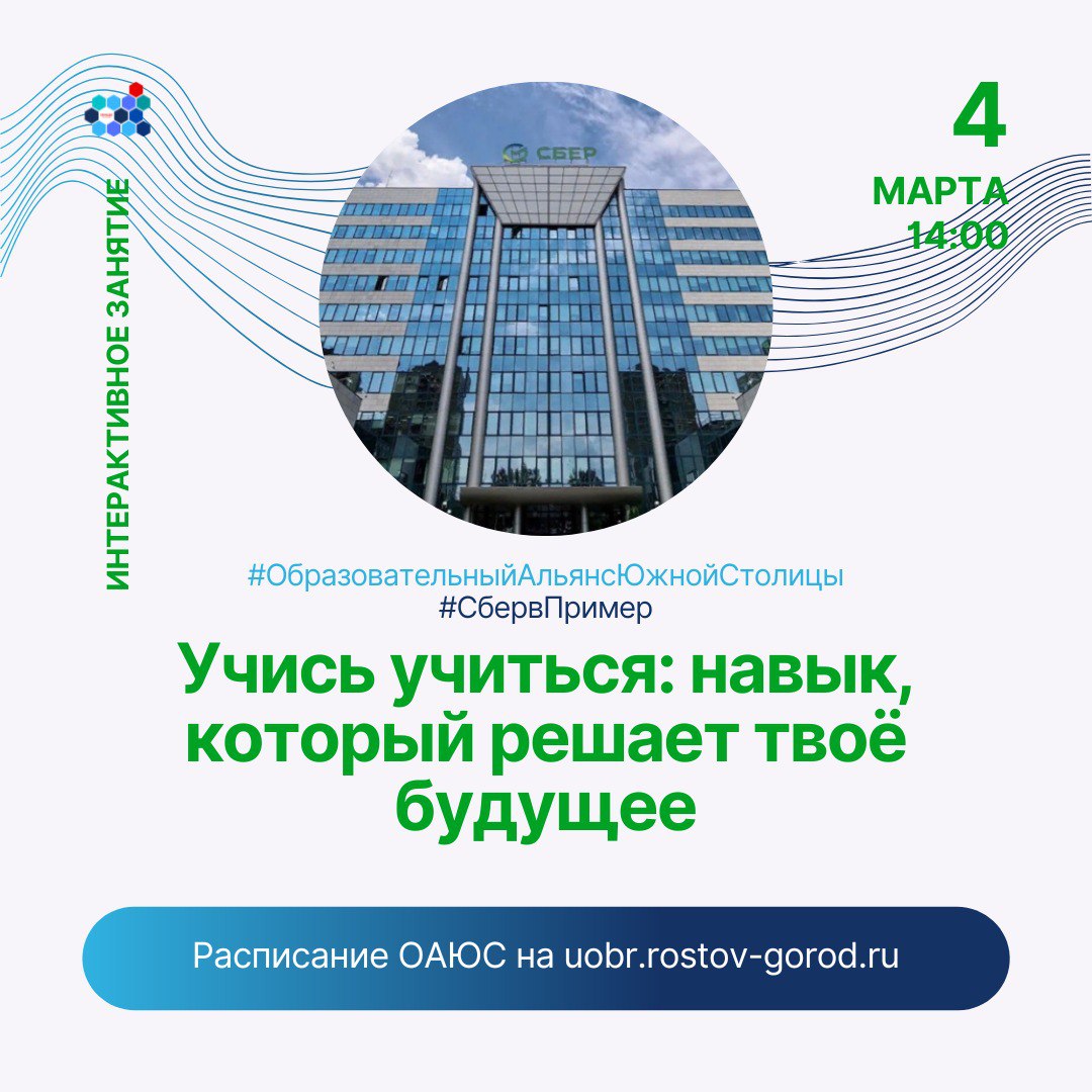 4 марта 2026 года в 14:00 в рамках проекта «Сбер в пример» состоялось интересное онлайн-занятие на тему «Учись учиться: навык, который решает твоё будущее». Организатором выступил Южный филиал Сбербанка России.