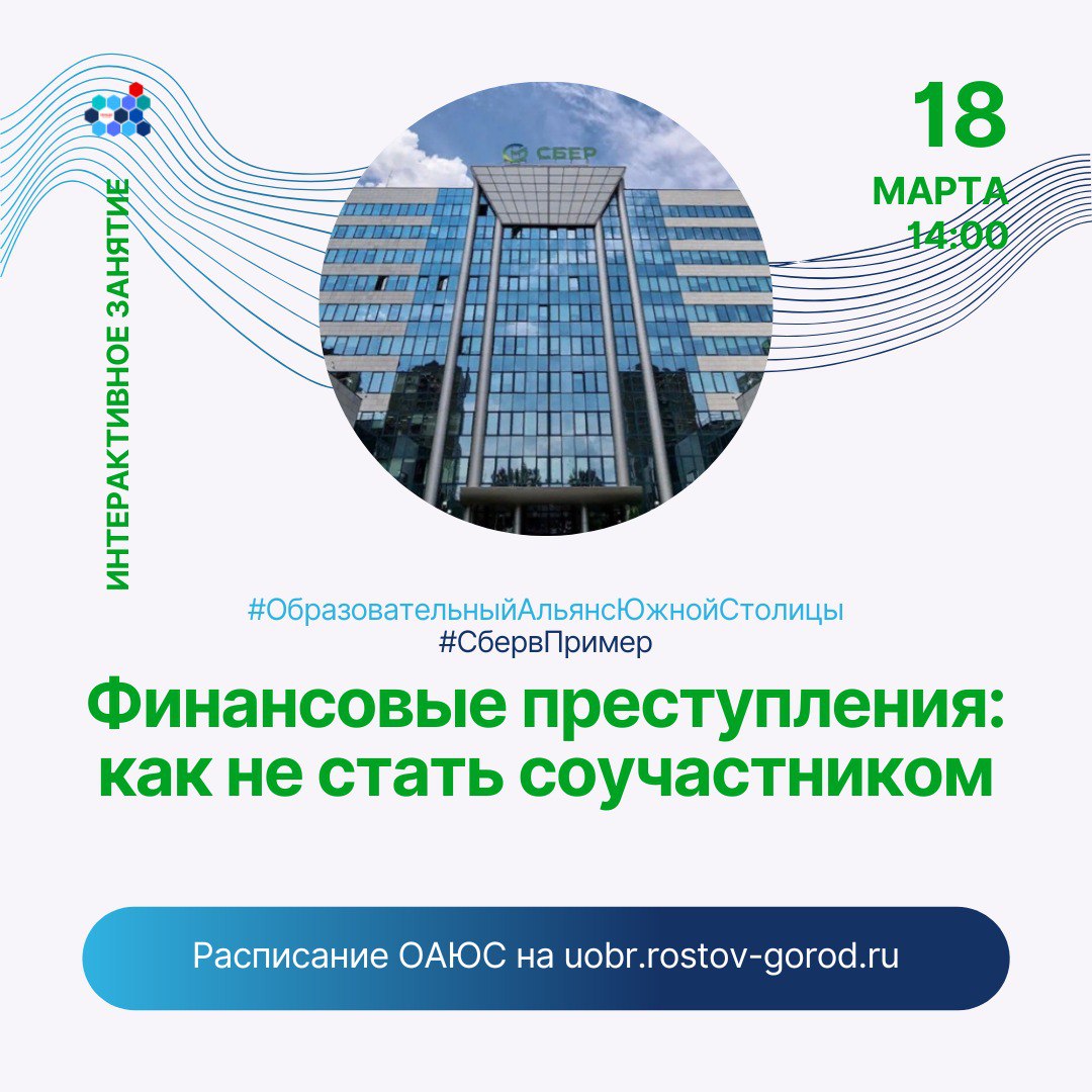 18 марта 2026 года в рамках проекта «Сбер в пример» совместно с Юго-Западным банком ПАО Сбербанк состоялось онлайн-занятие по развитию финансовой грамотности для учеников 7–11 классов. Тема встречи — «Финансовые преступления: как не стать соучастником» — была посвящена профилактике правонарушений в цифровой и финансовой среде.