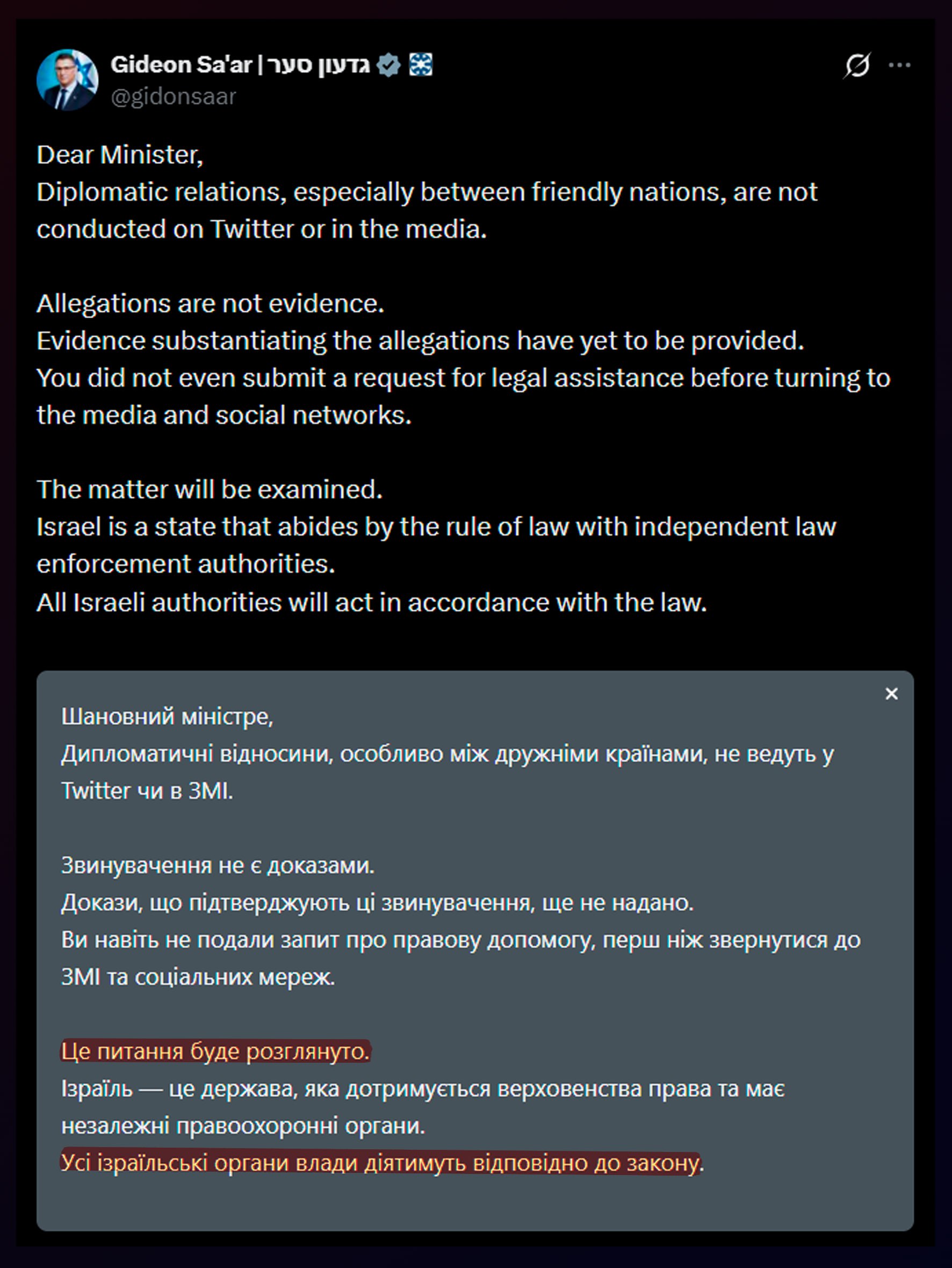За словами дипломата, якщо судно та його вантаж не будуть відхилені, Україна залишає за собою право застосувати повний спектр дипломатичних і міжнародно-правових заходів. Українське джерело також заявило, що Ізраїль «по суті проігнорував» попередні вимоги України щодо судна, яке раніше розвантажило вкрадене зерно в порту Хайфи.