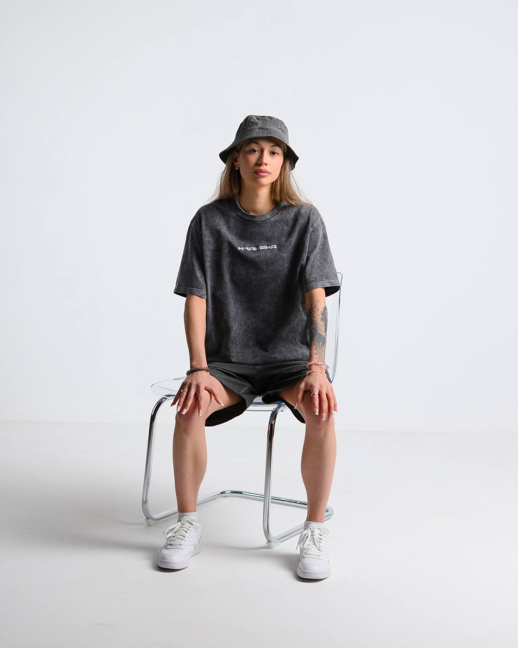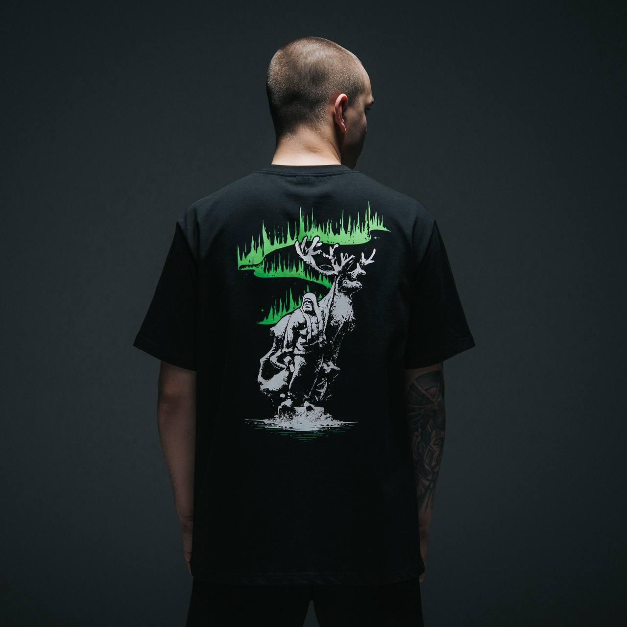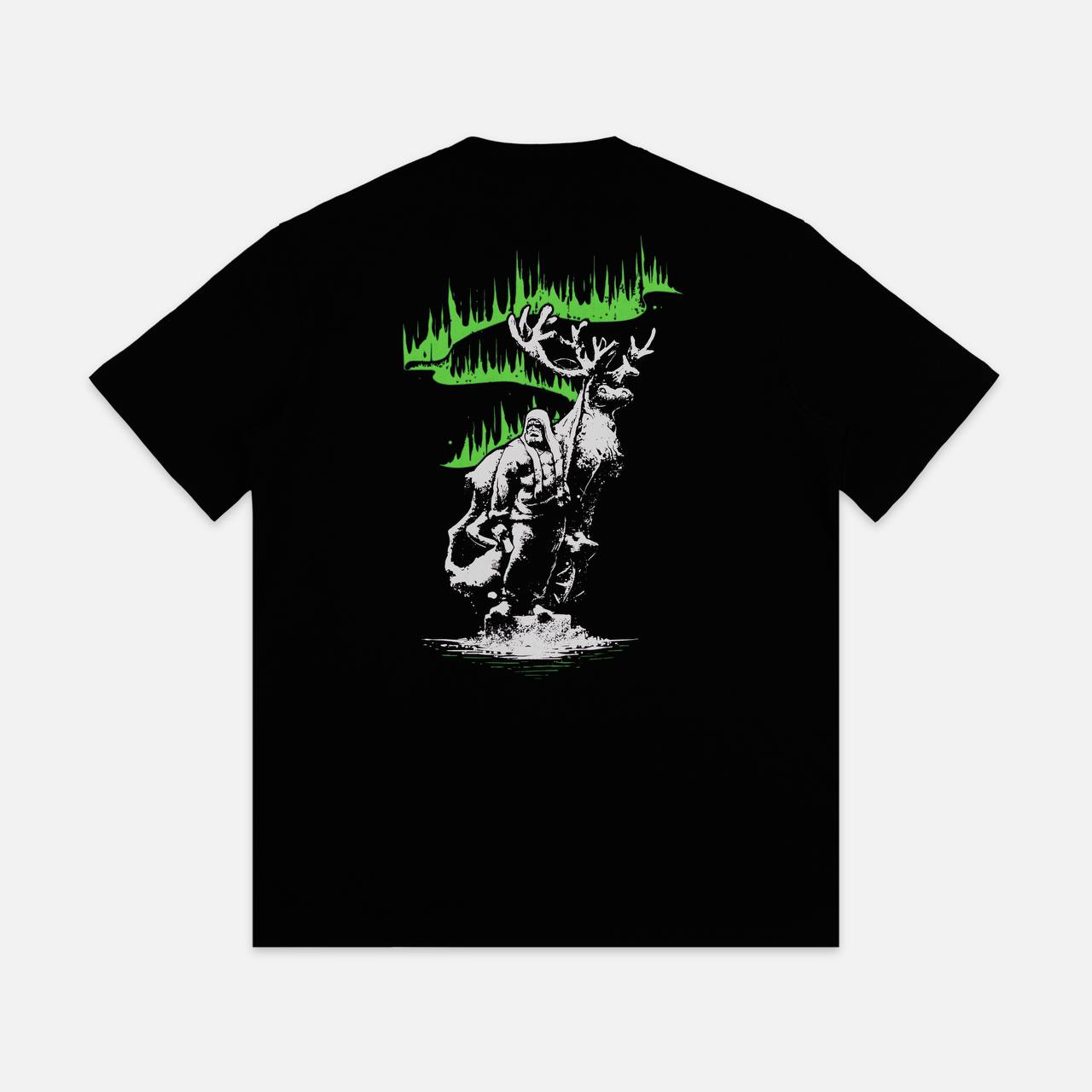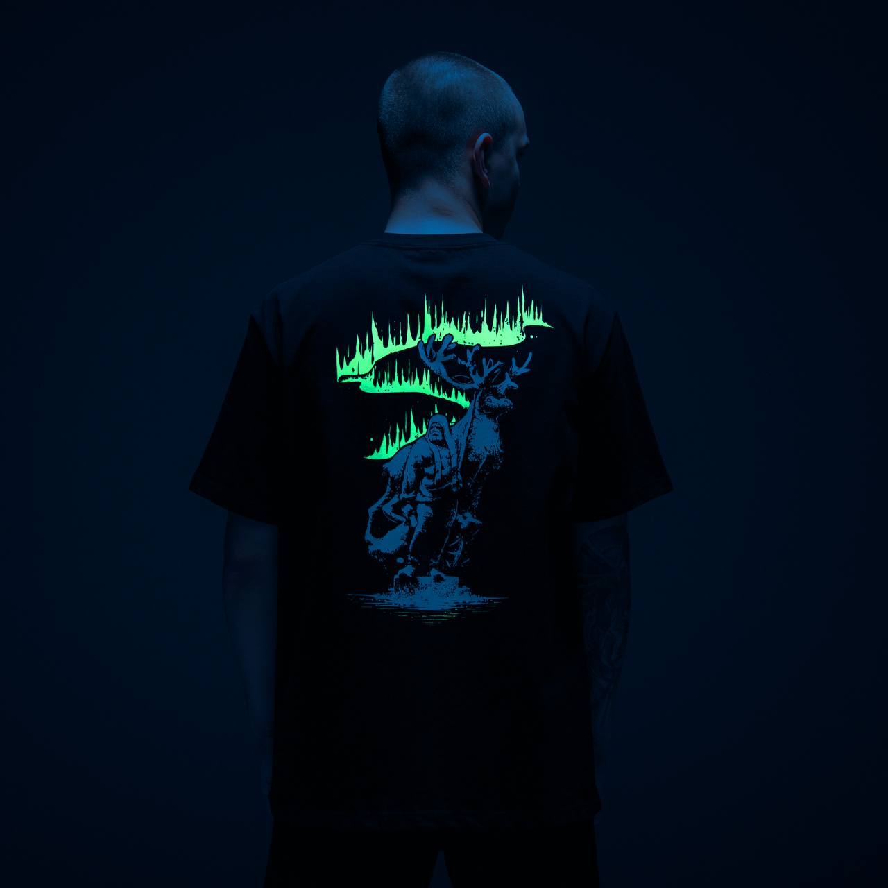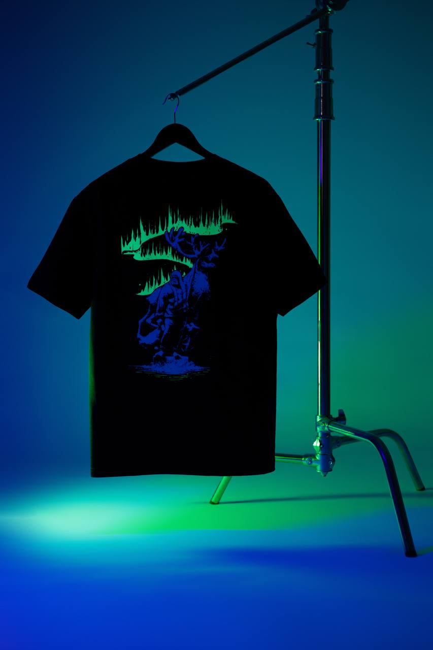 Пошита из премиальной кулирной глади плотностью 240 г/м2 производства фабрики Gulle. Изображение на спине нанесено шелкографией, а северное сияние выполнено флуоресцентными красками. Флуоресцентная краска светится под воздействием коротковолнового ультрафиолетового излучения. На груди надпись вышита.