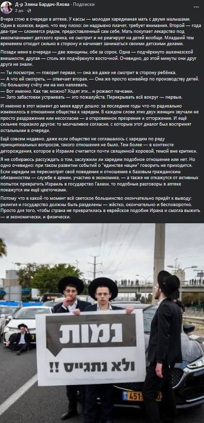 Я ни в коем случае не утверждаю, что пост д-ра Элины Бардач-Яловой несёт антисемитский оттенок — нет. Я прочёл его дважды. Но не нашёл в тексте, на мой взгляд, самого важного — осуждения двух женщин в аптеке, которые позволили себе унизительные комментарии в адрес матери-харедит и всей общины в целом.