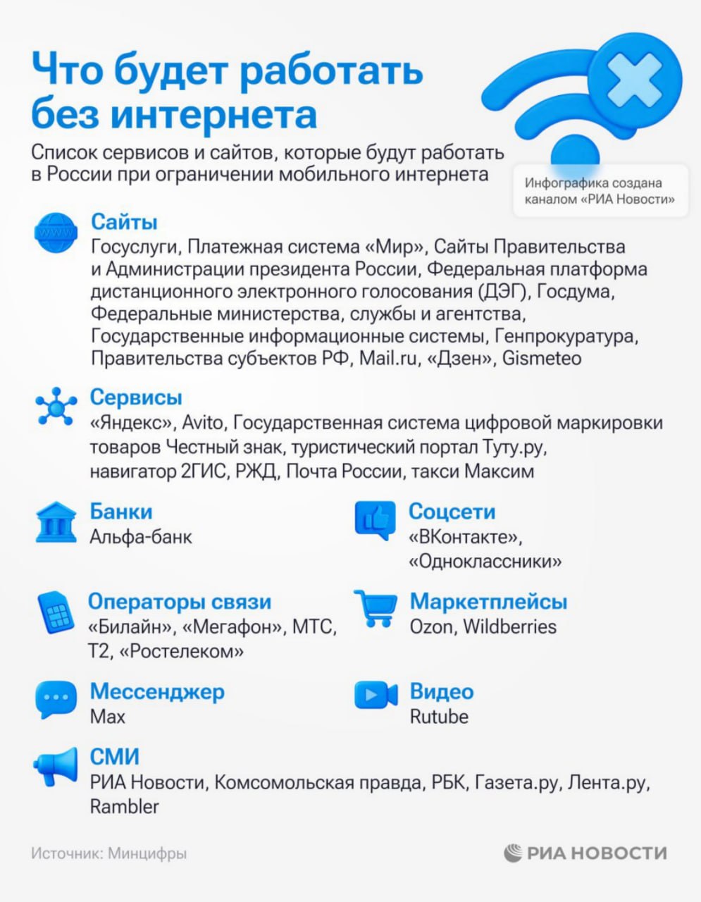 🚩✍️ «Министерство цифрового развития(у-ха-ха) опубликовало перечень российских сервисов и сайтов, которые, по его заявлению, продолжат работу в условиях возможного ограничения мобильного интернета или, вообще, тотального отключения от Интернета (обсуждается, по согласованию).