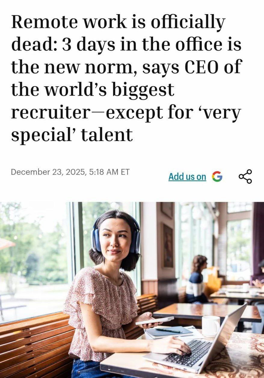 Удалёнка в 2026 году будет только для самых ценных специалистов, всех остальных вернут в офисы. Это станет новой привилегией, бонусом за талант, как премия для топ‑менеджеров, отмечают эксперты. Полная удалёнка будет лишь для тех, кого компании боятся потерять: сильных технарей, экспертов и фрилансеров с мощной сетью контактов. В условиях заморозки найма и остановки роста зарплат гибкий формат становится одним из последних рычагов, чтобы удерживать ценных сотрудников. @banki_oil