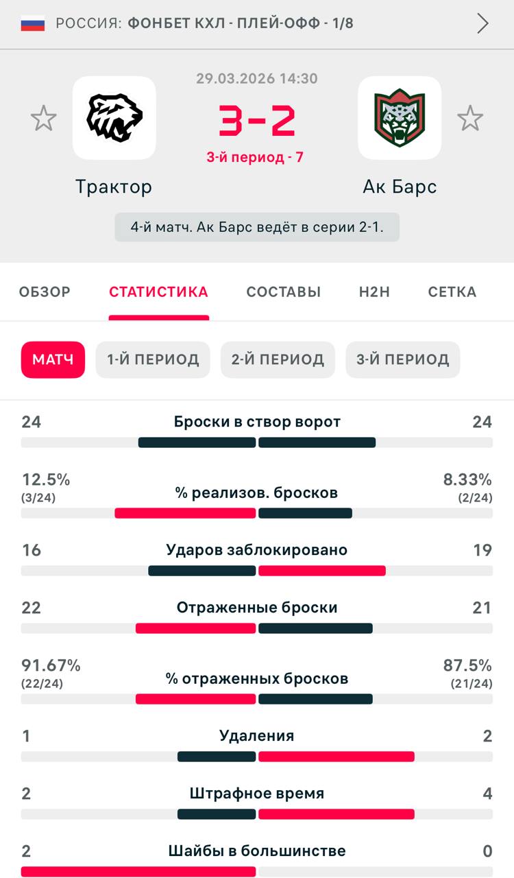 Третий матч показал ещё одну важную вещь: серия очень нервная и контактная. Было много стыков, потасовок, удалений, а это напрямую влияет на темп и даёт дополнительные спецбригады. При этом Трактор дома играет агрессивнее и чаще лезет в давление, а Ак Барс достаточно хорош в том, чтобы наказывать в ответных фазах. Когда одна команда добавляет в активности, а вторая умеет пользоваться пространством, матч проще уходит в обмен голами, чем в условные 1:2.