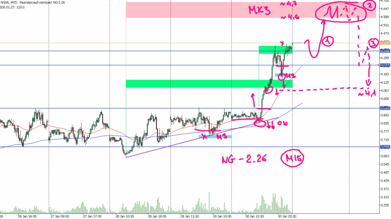 Если прикидывать по целям импульсного лонгового движения, то МКЗ по шортам у нас на 4,6-4,7. А если смотреть на точку потенциального отката, то объективные лонги у нас пошли от ~4,1. Т.е. можно будет попробовать поискать шорт к 4,1, но только после отработки МКЗ 4,6.
