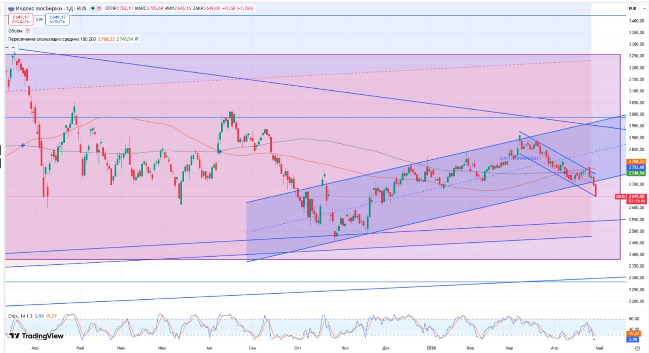 Волатильность на рынке акций сохранялась и на текущей неделе. Текущее значение индекса Мосбиржи — 2653 пункта, что ниже уровней прошлой недели (2733 пункта) на 2,9%. Технически по рынку сформировался негативный сигнал по выходу индекса Мосбиржи вниз из среднесрочного восходящего канала, сформировавшегося в октябре 2025 года, и спекулянты отыгрывают возможную коррекцию по индексу до уровня 2550 пунктов.
