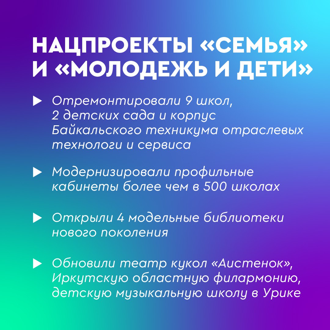 На встрече с министром здравоохранения Михаилом Мурашко обсуждалось строительство новых поликлиник в Хомутово, Маркова и Усть-Ордынском, а также завершение работ в радиологическом корпусе областного онкодиспансера. С представителями минпросвещения – Андреем Николаевым и Александром Бугаевым – рассмотрели вопросы финансирования капремонтов и строительства школ, в том числе в микрорайоне Союз Иркутска и в Маркова, а также участие региона в программе по развитию детских оздоровительных учреждений.