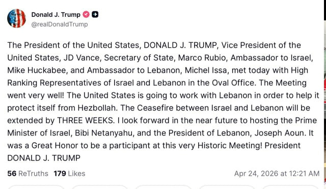 Перемирие между Израилем и Ливаном будет продлено на три недели, сообщил Трамп в Truth Social.