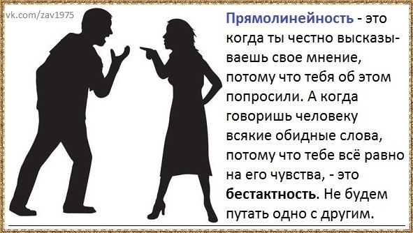 Прямолинейность — это когда ты честно высказываешь свое мнение, потому что тебя об этом попросили. А когда говоришь человеку всякие обидные слова, потому что тебе все равно на его чувства, — это бестактность. Не будем путать одно с другим. Мы же тут тренируемся быть мудрыми и миротворцами, а не слонами в посудной лавке!