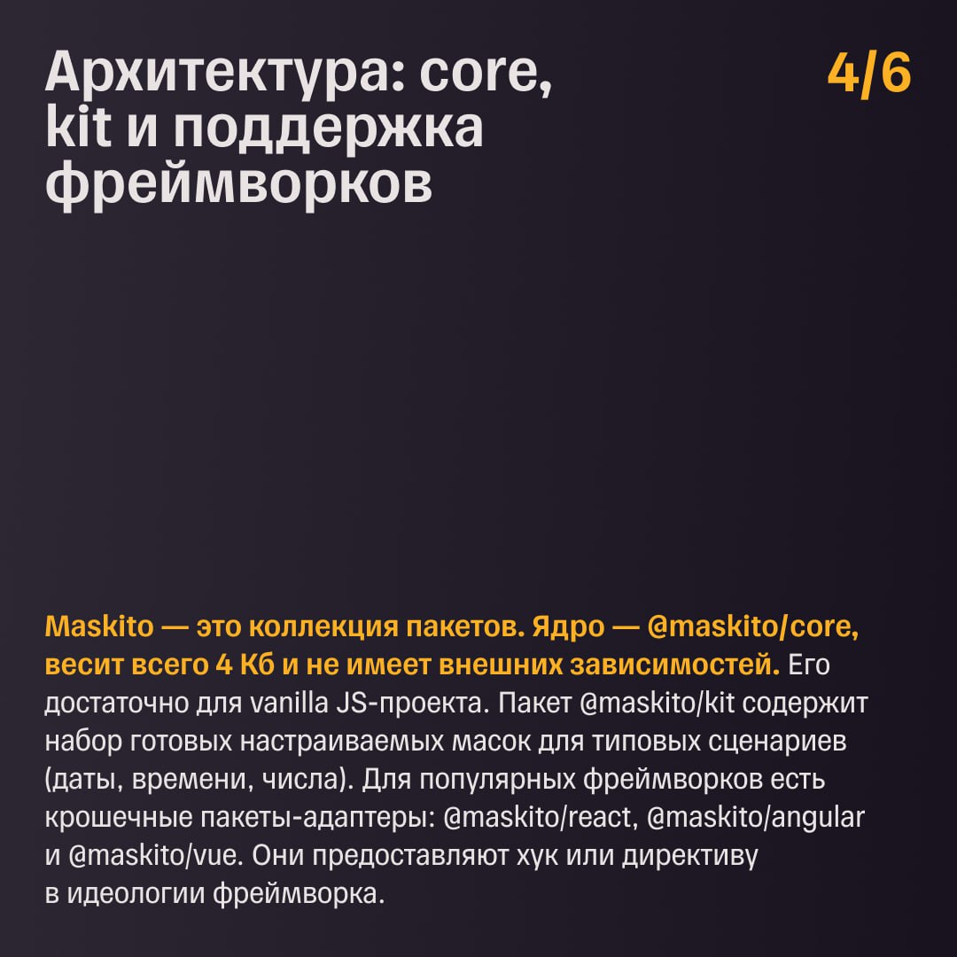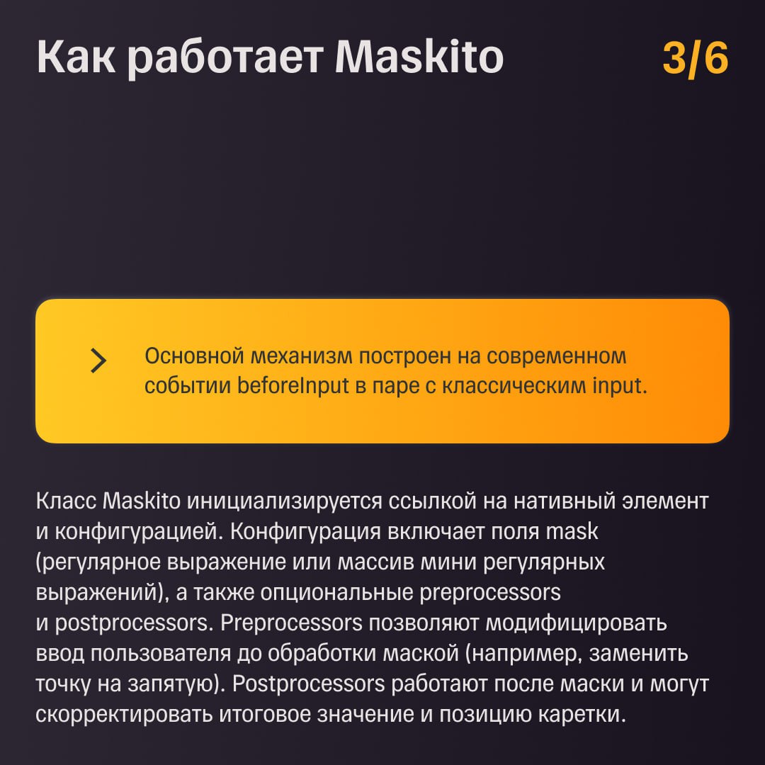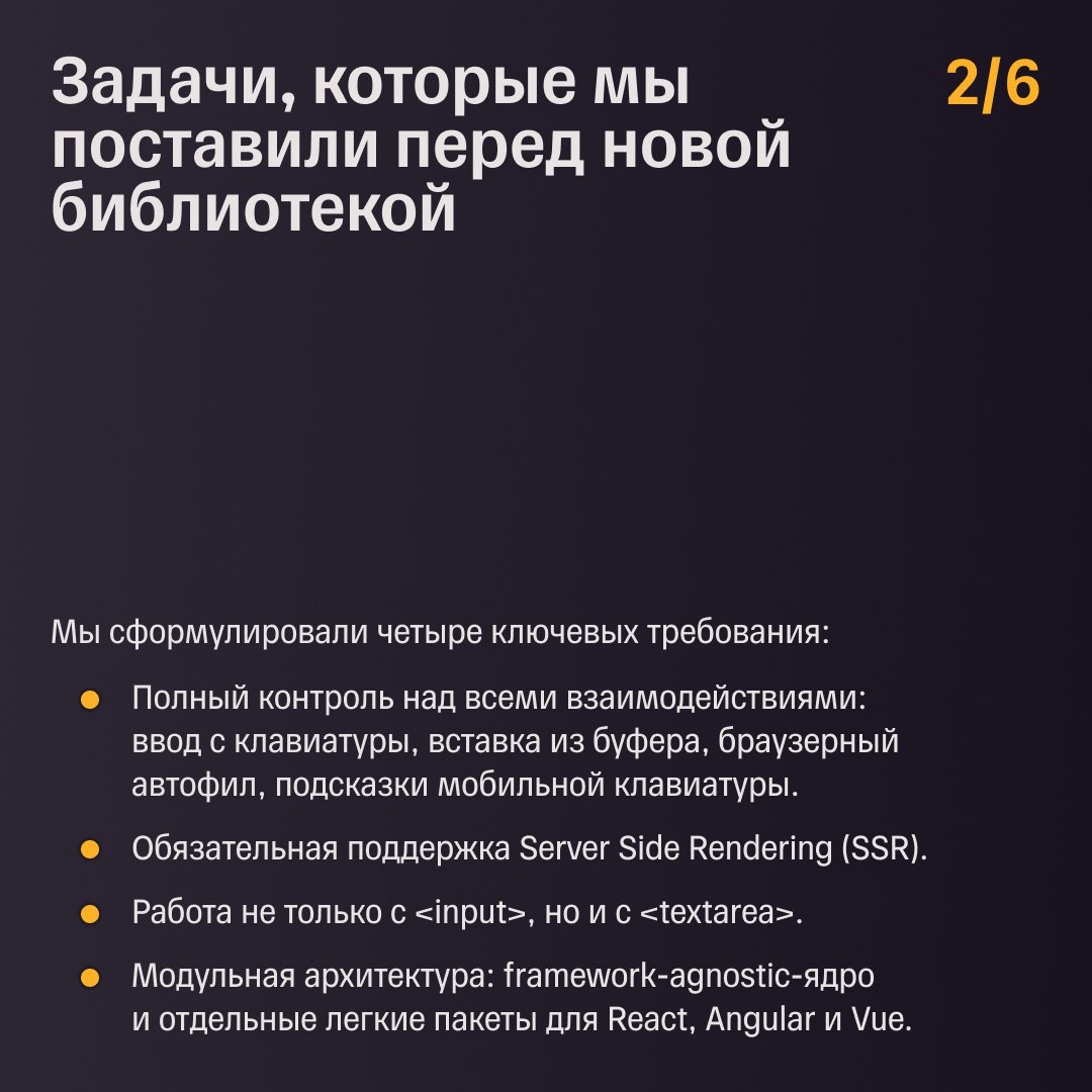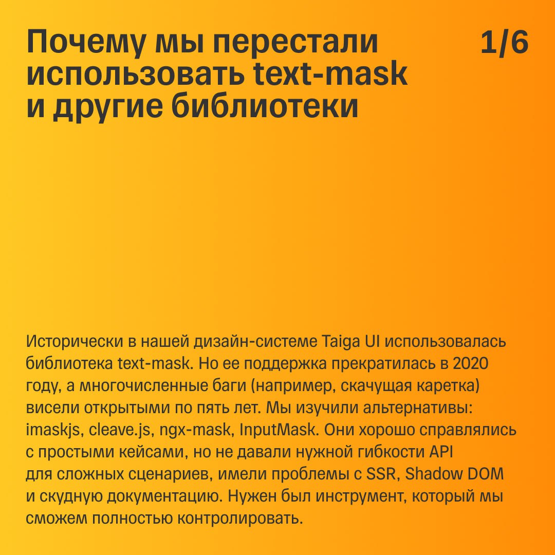 В карточках рассказываем об устройстве библиотеки, а попробовать ее в деле и попрактиковаться в написании масок для телефона, банковской карты и чисел с дробной частью можно на нашей конференции T-Sync Conf уже 7 февраля. Будем ждать вас в контуре UX/UI ✨