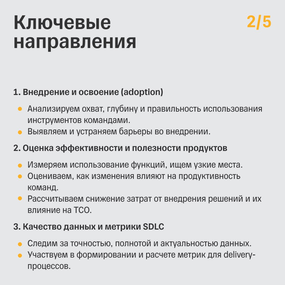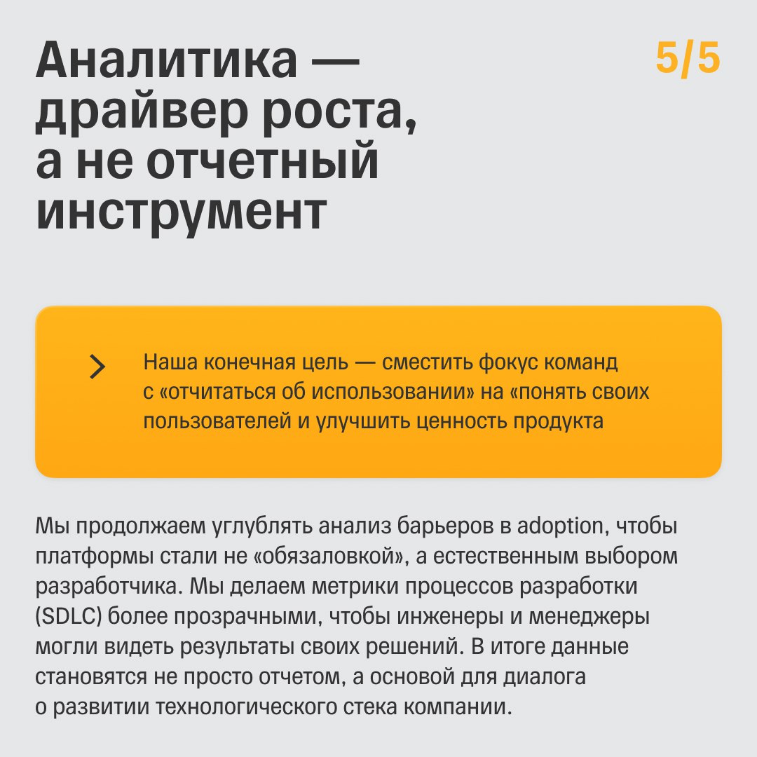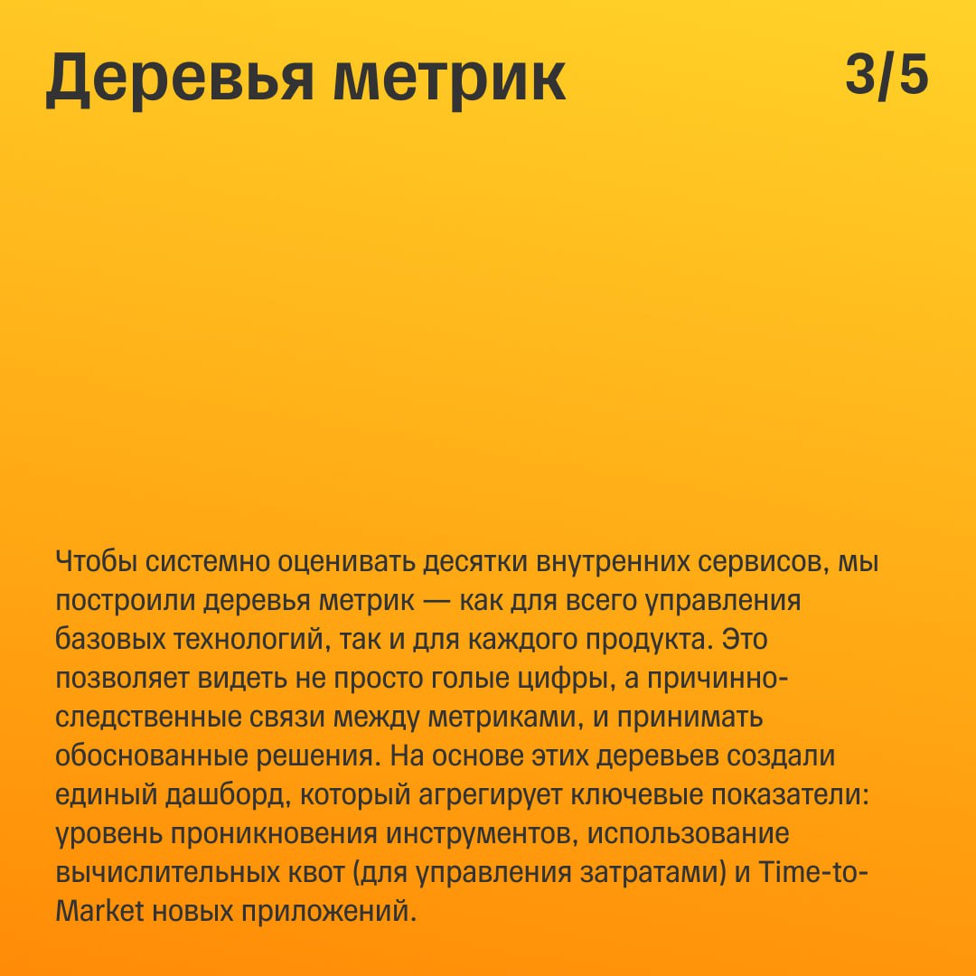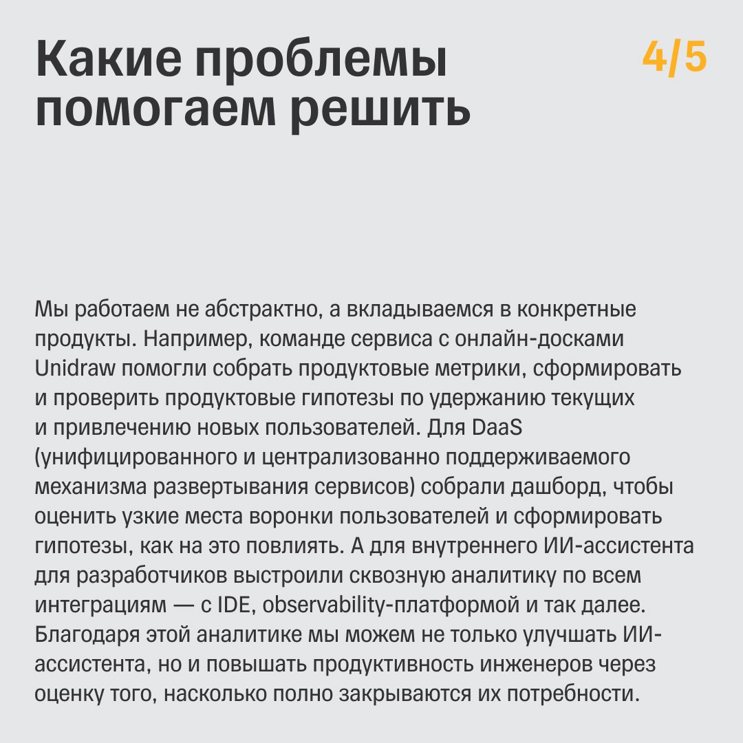 За это отвечает наша команда продуктовой аналитики в управлении базовых технологий, которая превращает качественные «удобно» и «быстро» в количественные метрики для продуктов, от которых зависят тысячи разработчиков.
