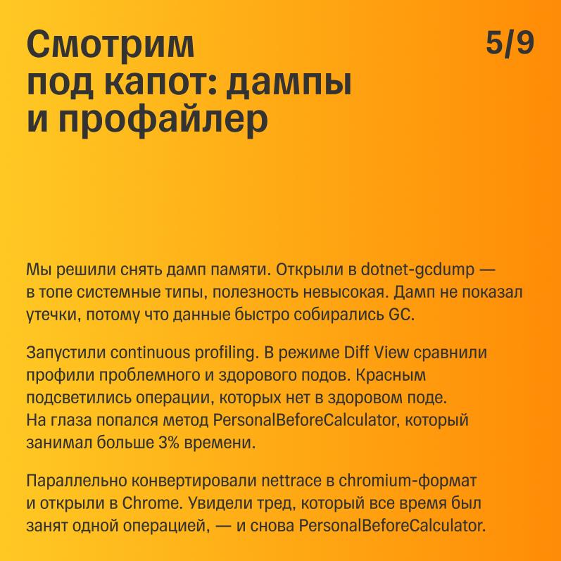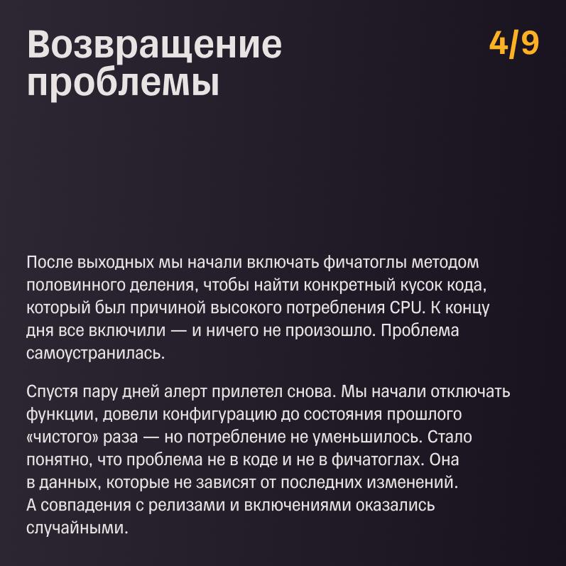 😎 В карточках наш разработчик Антон Пронькин поделился, как мы заметили проблемы с CPU, на что выделялись гигабайты памяти, почему откат не помог, как ловили баг с помощью дампов и профайлера и при чем тут Австралия. А еще больше подробностей и графиков — на Хабре.