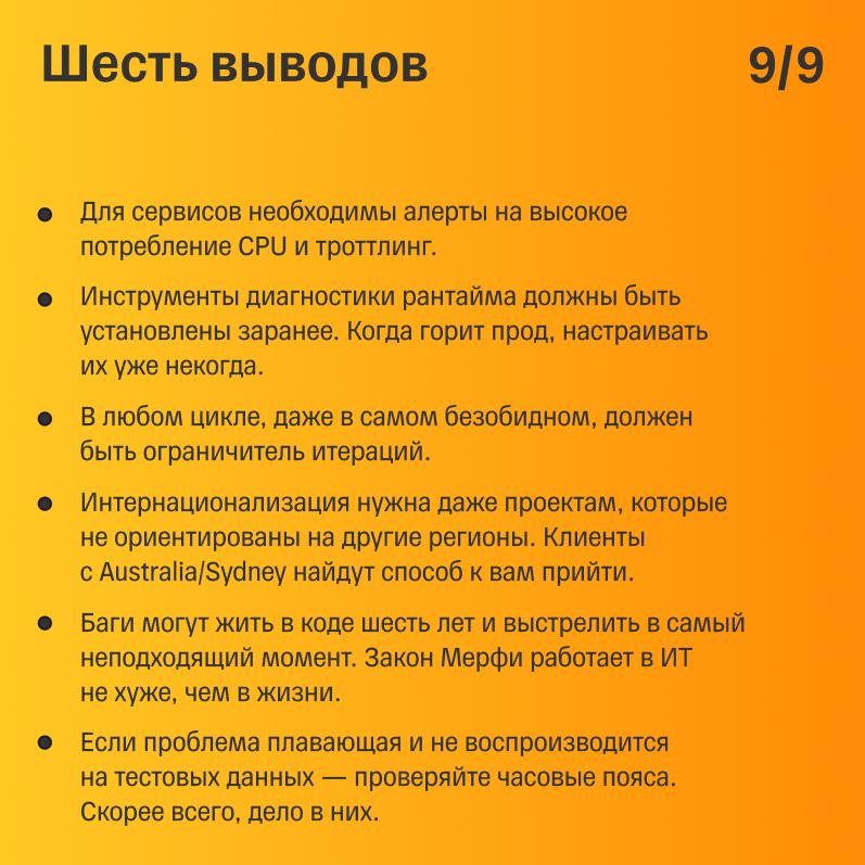 Наш сервис продаж для юридических лиц работал шесть лет без нареканий и ошибок. Обычный бэкенд, который держит 30 RPS, обрабатывает миллион джобов в день и ест 125ms CPU. В начале года нам нужно было перевести его с NoSQL на PostgreSQL, и спустя час после деплоя прилетел алерт: CPU вырос в 10 раз. Поды начали перезапускаться, а у нас начался долгий траблшутинг.