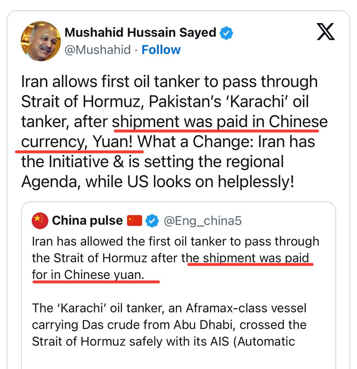 В это время первый танкер, оплативший нефть в юанях, получает Ормуз-пасс. Им стал пакистанский “Карачи”.