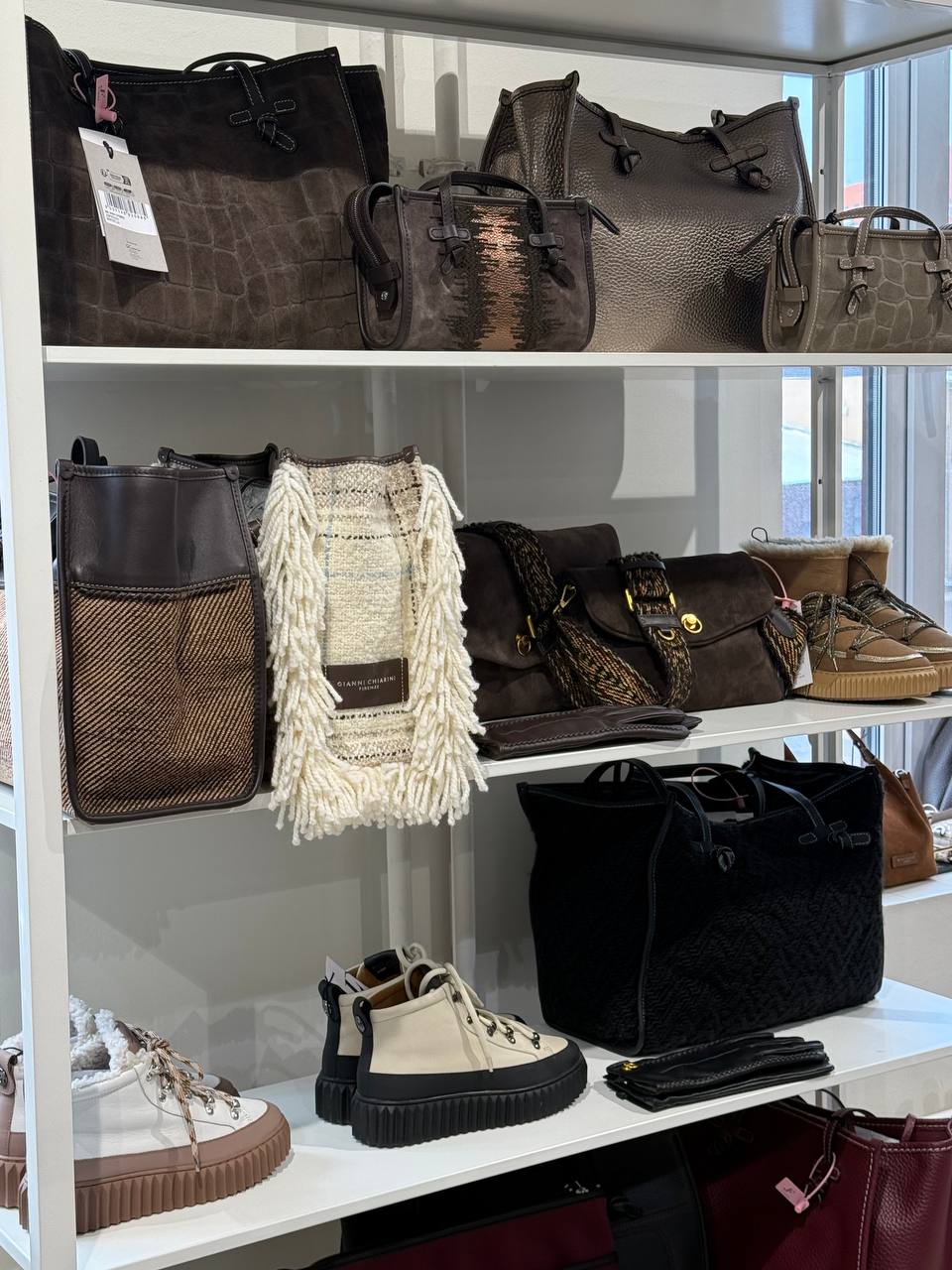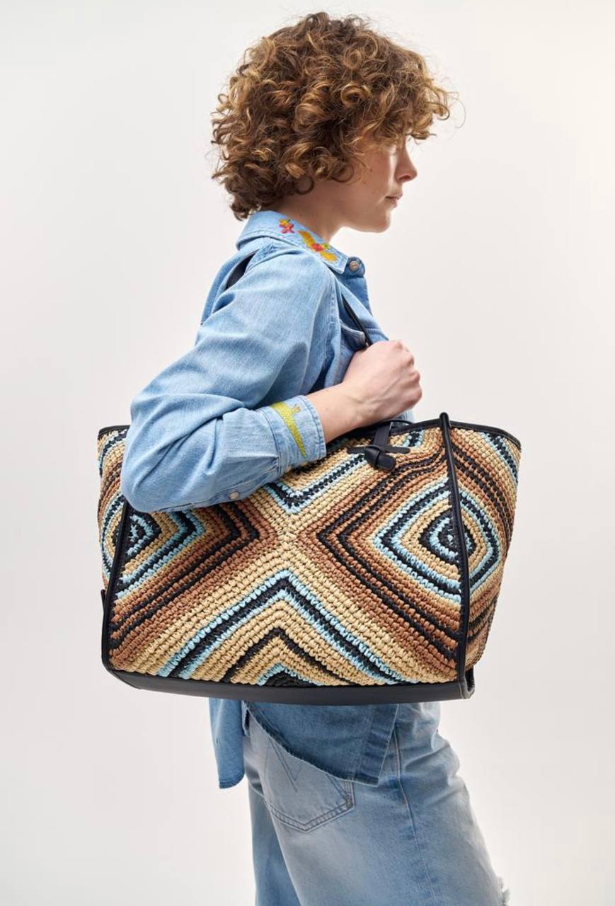 А вот этот тоут из рафии от GIANNI CHIARINI с этническим узором влюбил меня в себя моментально! В комплекте идет кожаный клатч для мелочей.