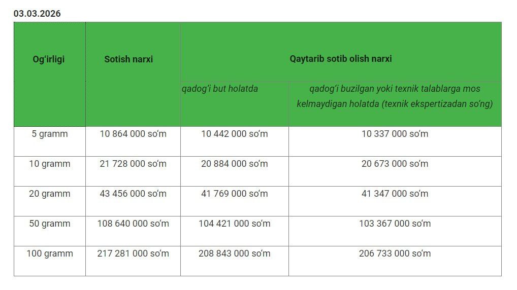 2026 йил 3 март ҳолатига кўра, Ўзбекистонда 1 грамм олтин қуймаси нархи 2 млн 173 минг сўмни ташкил этмоқда. Буни бемалол рекорд кўрсаткич дейиш мумкин, чунки 29 январь куни ҳам нарх айнан шу даражага чиқиб, энг юқори натижа қайд этилган эди.