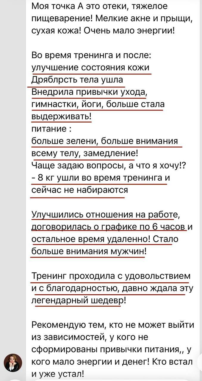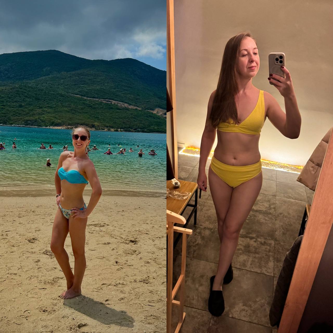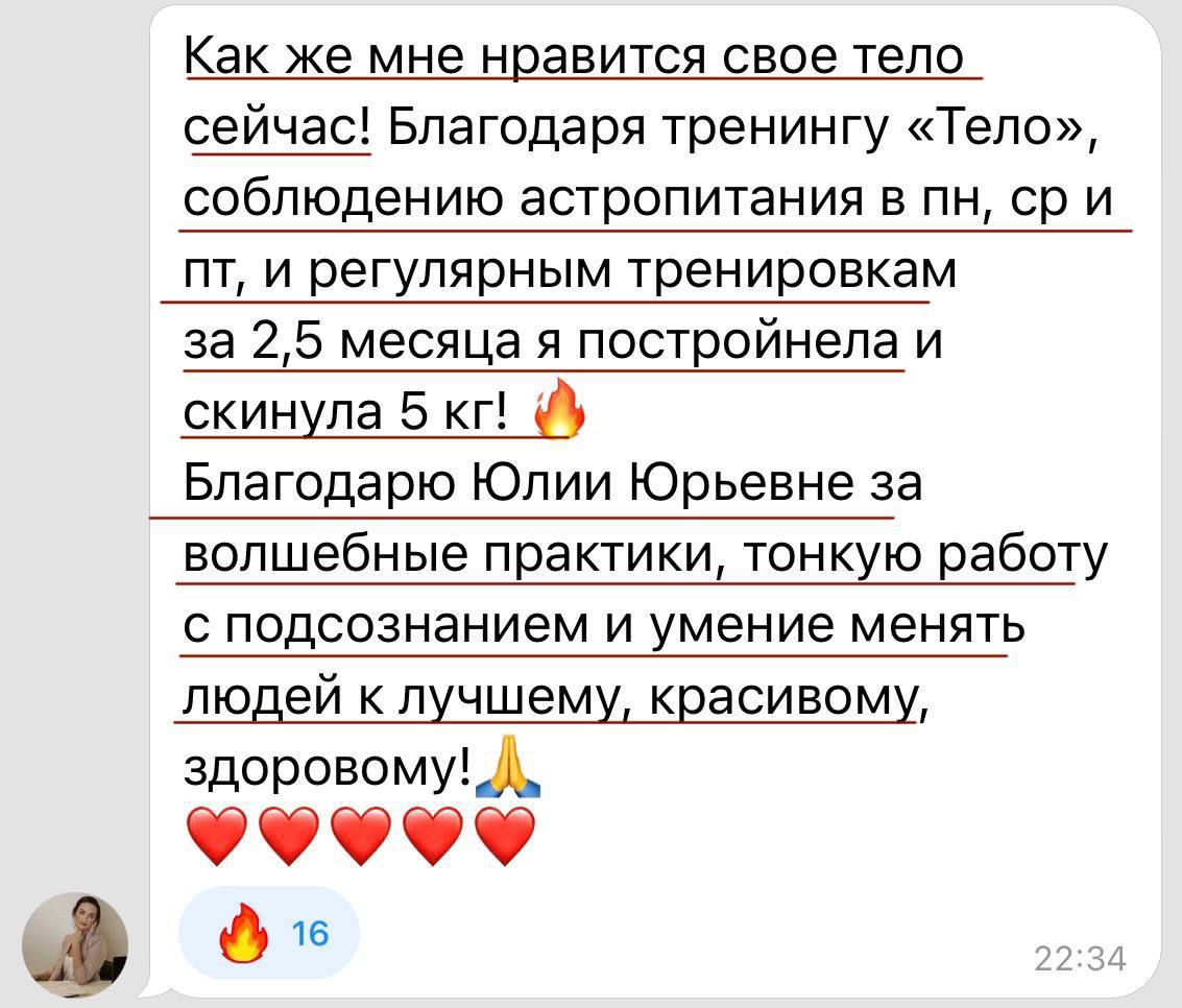 Юлия Юрьевна, огромная благодарность за тренинг «Тело». На фото: 1 фото-результат на сегодня (🤩подтянутость, -5 кг, удовольствие от тела, желание заниматься спортом, выносливость, любование собой в зеркале и на фото, да и просто в жизни совсем другое ощущение себя), 2 фото-мое тело до тренинга (отеки, много к себе критики, я без спорта, без энергии, нет выносливости, нет желания даже фотографироваться (нет практически фото в телефоне в купальнике 😥)