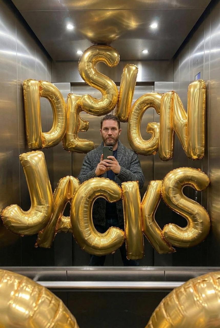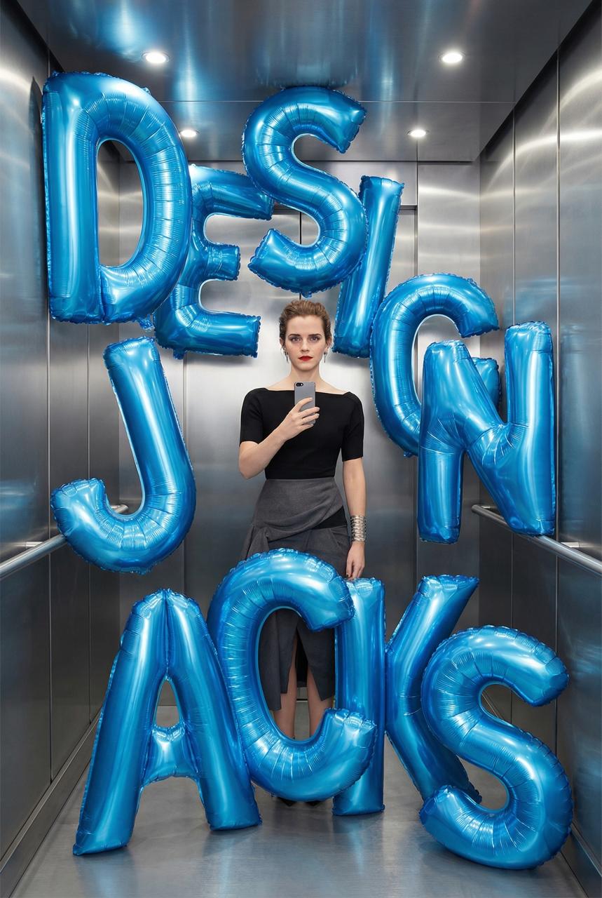 Добавьте к кадру гигантские, почти сюрреалистические надувные буквы, формирующие фразу «[DESIGN JACKS]». Каждая буква — отдельный трёхмерный надувной объект, превышающий человеческий рост, выполненный из блестящей синей фольги и плотного надувного материала с видимыми швами, мягкими складками и реалистичной деформацией под давлением воздуха.