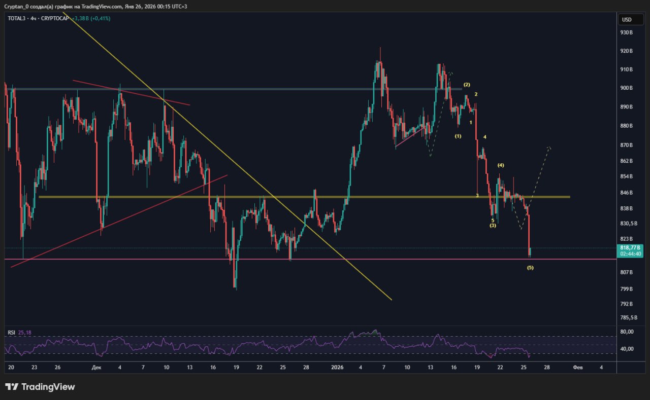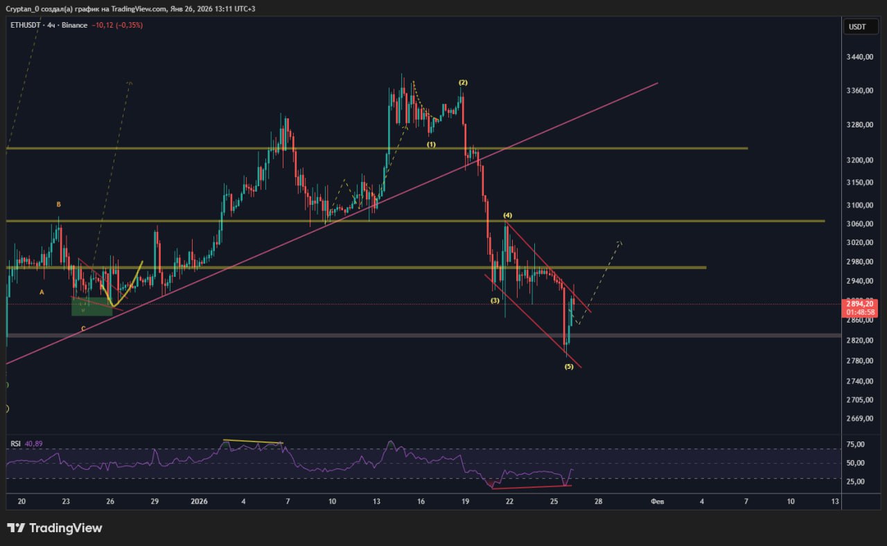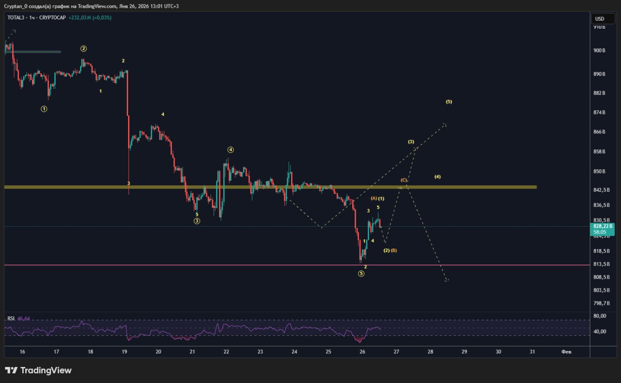 📈 Первый положительный сценарий, это заходной импульс перед продолжением импульсной структуры и дальше нас ждут волны еще 2 волны роста, (желтые стрелки), это идеальный вариант для хорошого отскока на альте, про который я писал ранее.
