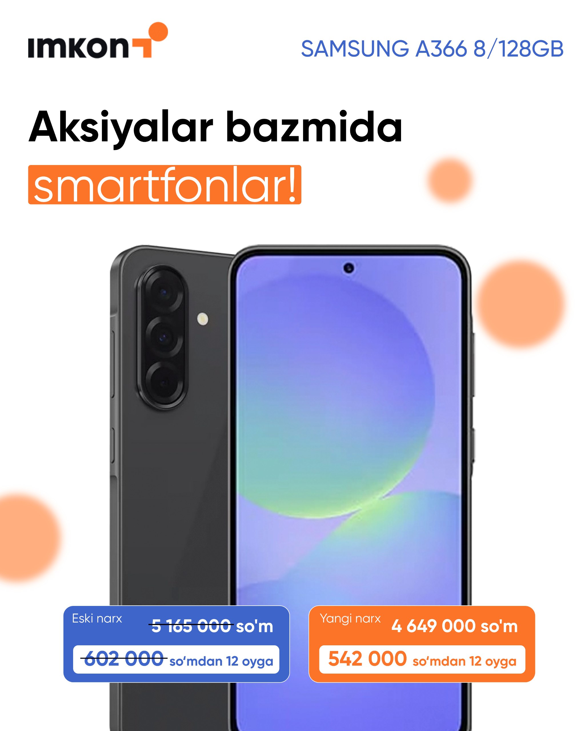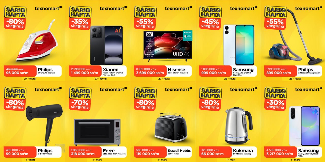 Barcha turdagi smartfonlarni boshlang'ich to'lovsiz, birgina passport bilan 12 oyga maxsus chegirma bilan xarid qilishingiz yoki katta bonus olishingiz mumkin! 📱