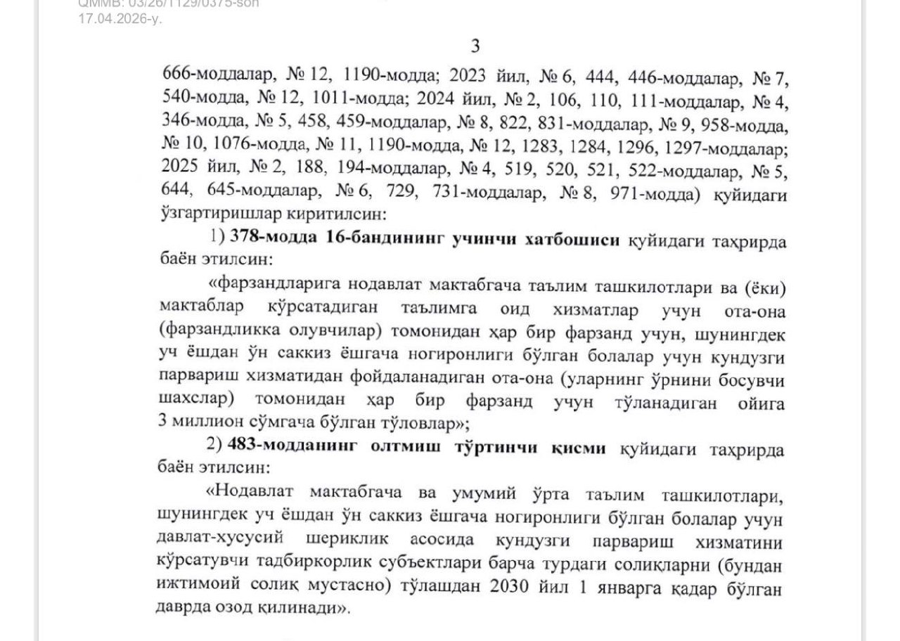 ❗️3 ёшдан 18 ёшгача ногирон болалари учун кундузги парвариш хизматидан фойдаланадиган ота-она томонидан ҳар бир фарзанд учун тўланадиган ойига 3 миллион сўмгача бўлган тўловлар солиқдан озод этилди.